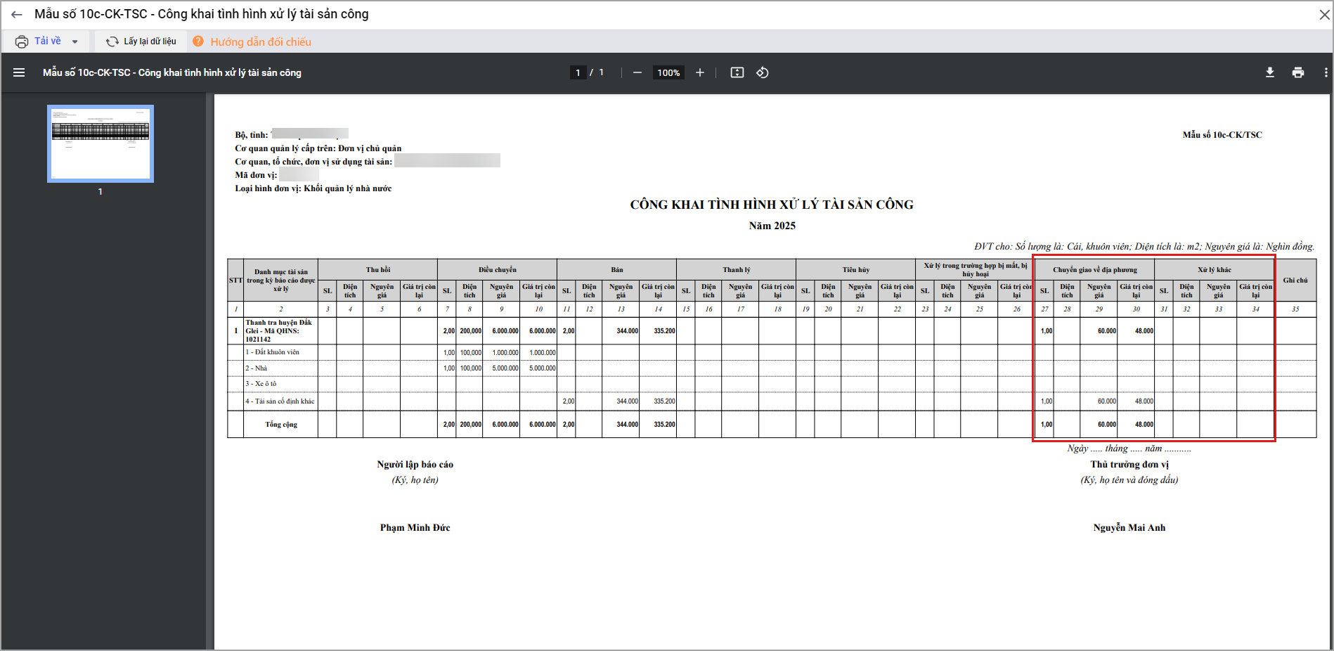Vì vậy, nên trên báo cáo 10c-CK-TSC báo cáo không lấy lên các tài sản có lý do là Chuyển giao về địa phương, Hình thức khác theo quy định của pháp luật, sử dụng tài sản công.