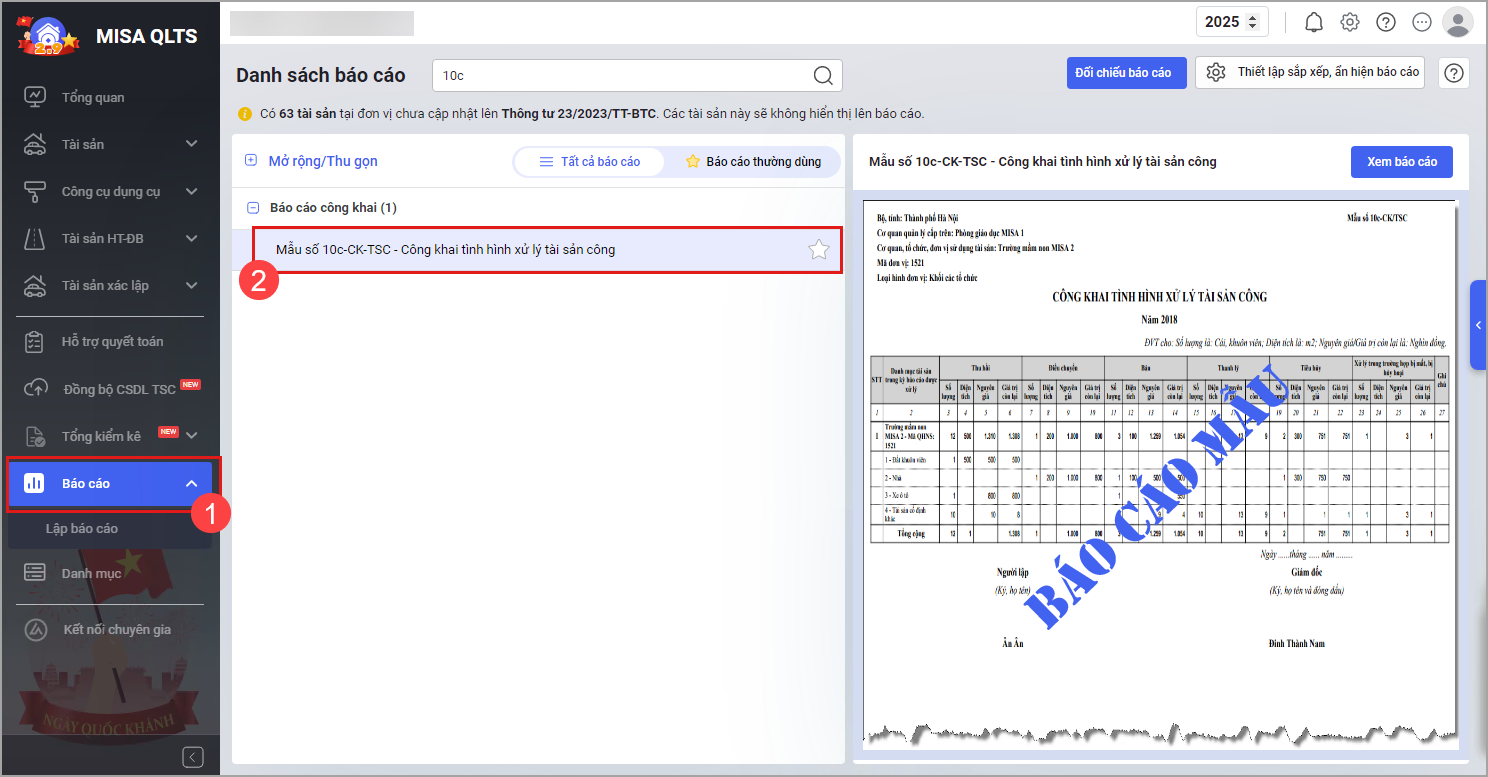 Để in Mẫu số 10c-CK-TSC, anh/chị vào Báo cáo\Báo cáo kê khai\chọn Mẫu số 10c-CK-TSC – Công khai tình hình xử lý tài sản công.