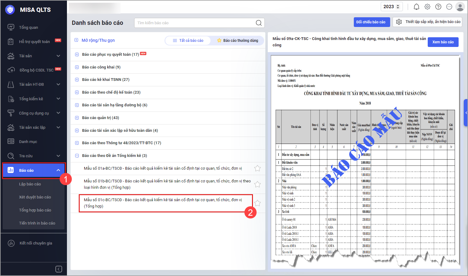 Bước 1: Vào Báo cáo\Báo cáo theo để án Tổng kiểm kê, chọn Mẫu số 01c-BC/TSCĐ quy định tại Quyết định 1138/2024/QĐ-BTC