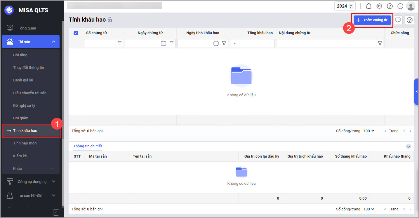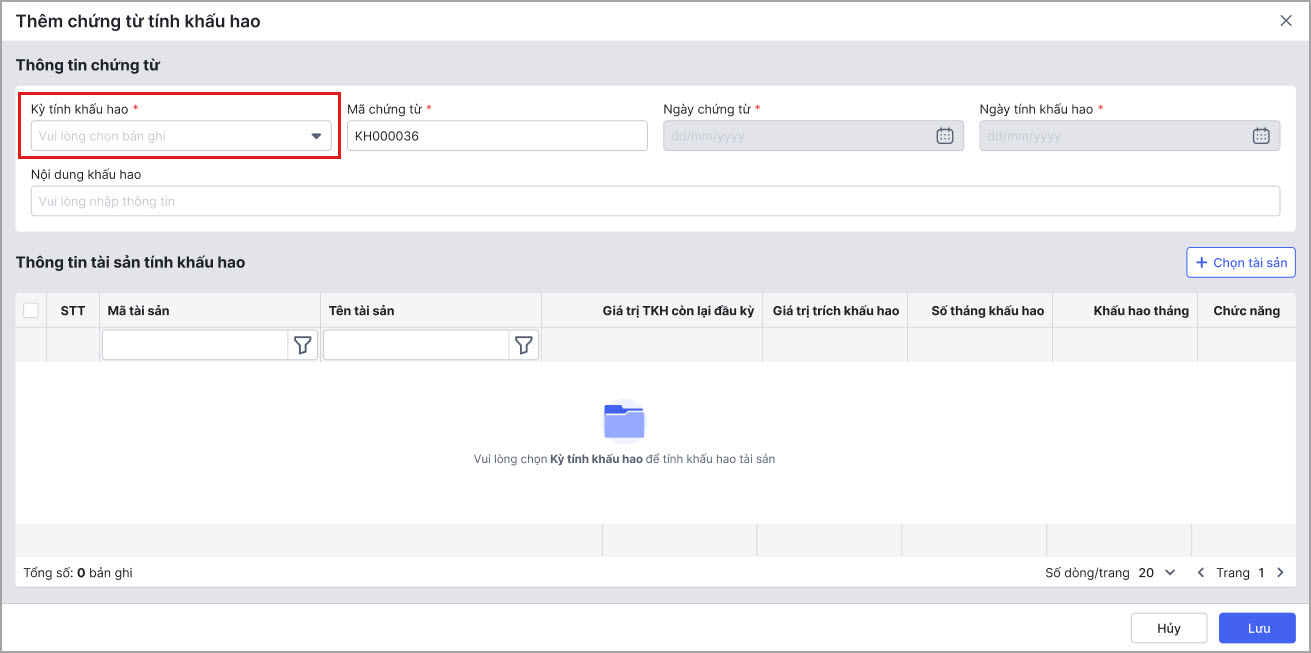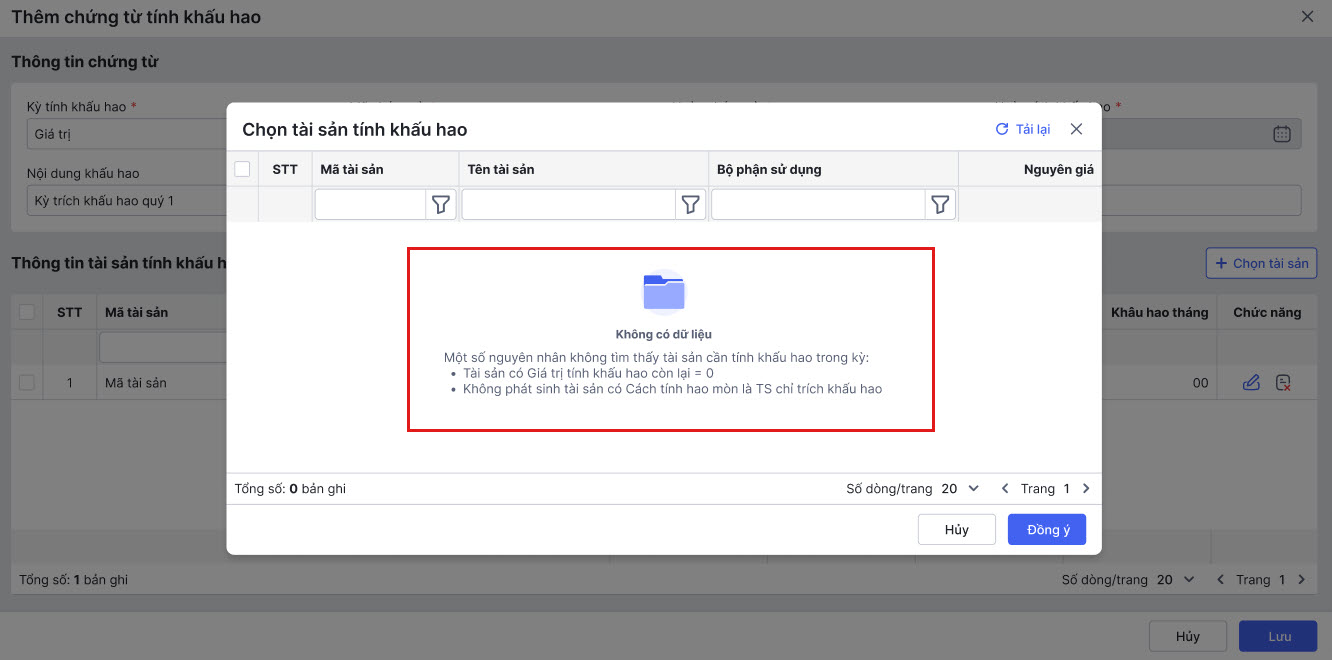 Nếu đơn vị có tất cả tài sản có cách tính hao mòn là chỉ tính hao mòn, thì khi lập chứng từ trích khấu hao sẽ không hiển thị thông tin tài sản