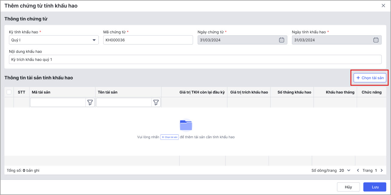 Bước 3: Nhấn Chọn tài sản để lập chứng từ tính khấu hao