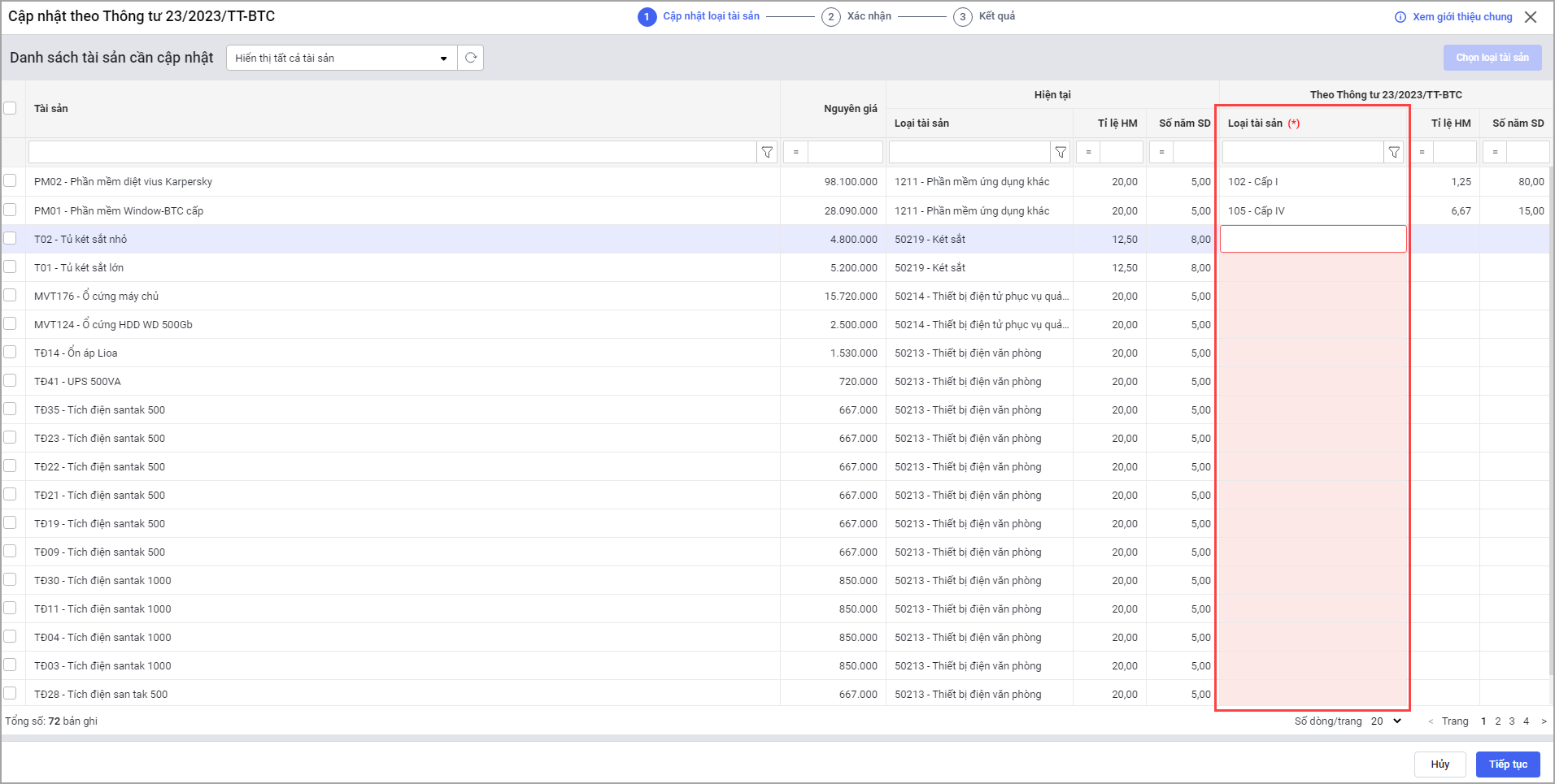 - Tại Tài sản\Cập nhật theo Thông tư 23/2023/TT-BTC\Cập nhật thủ công: Khi chọn tài sản thì phần mềm tự động bôi đỏ trường thông tin hiển thị cảnh báo Loại tài sản không thể để trống, anh/chị chọn loại tài sản theo thông tư 23/2023/TT-BTC. Sau đó nhấn Tiếp tục.