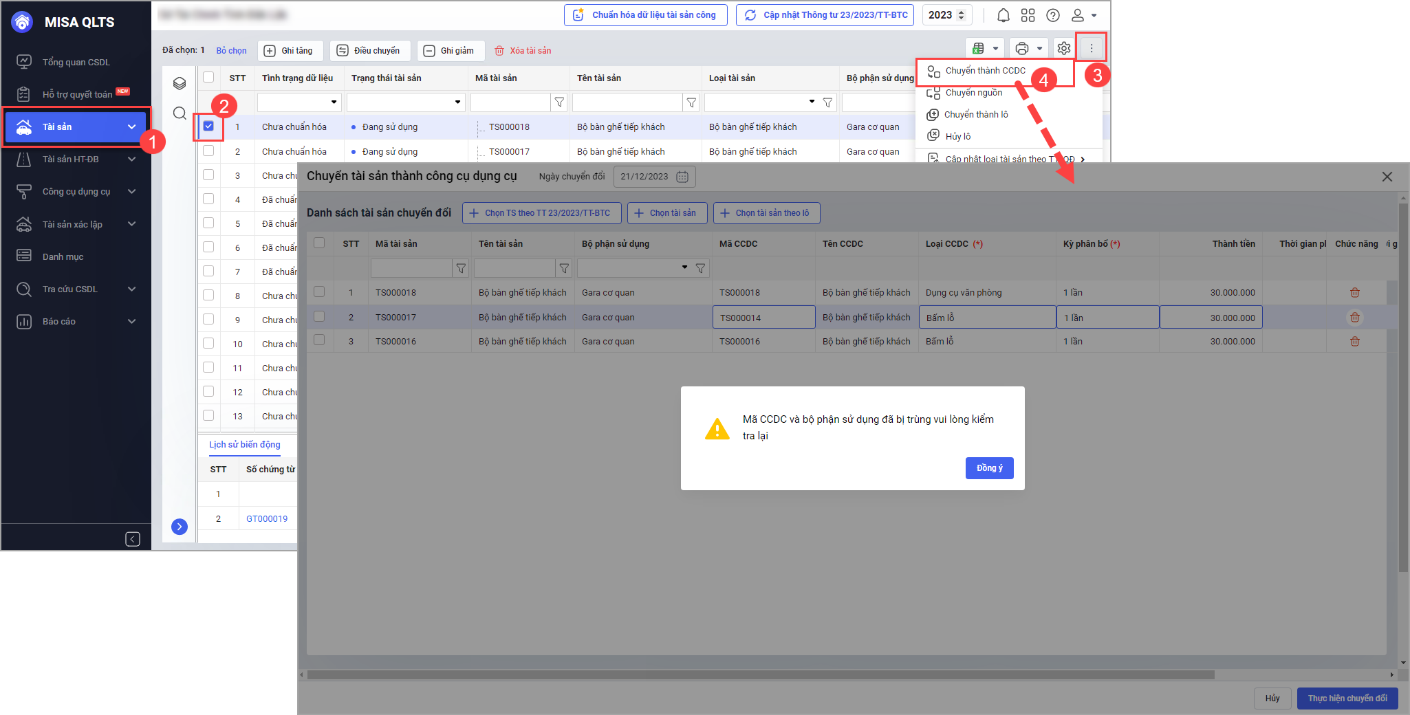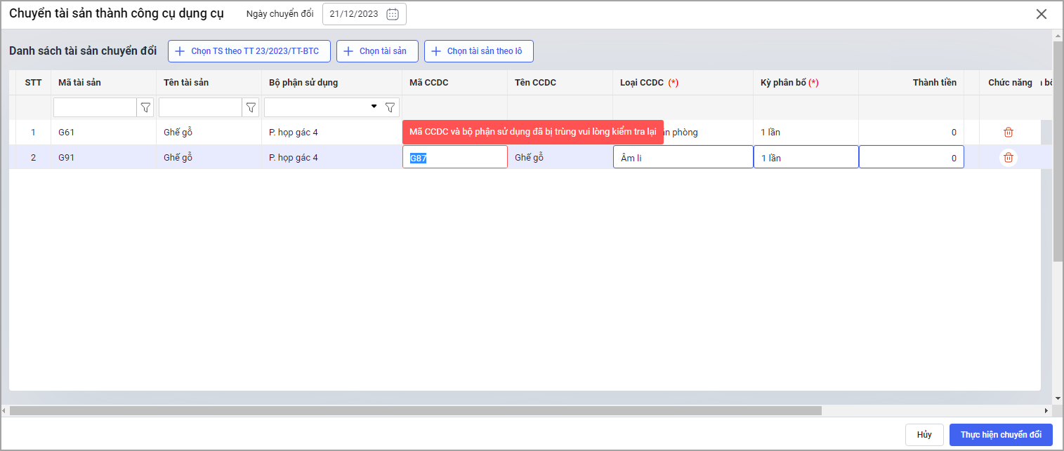 - Tại Tài sản\Tùy chọn\Chuyển thành CCDC: Đối với mã CCDC chuyển từ Tài sản bị trùng sau khi thực hiện chuyển đổi phần mềm sẽ hiển thị cảnh báo.