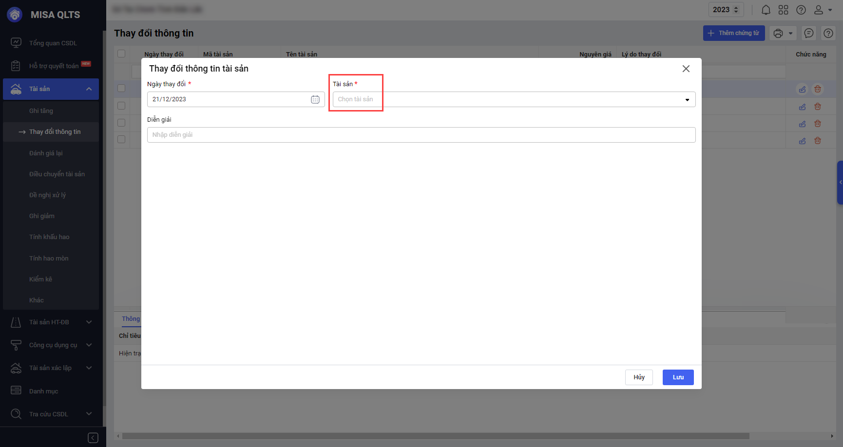 - Tại Tài sản\Thay đổi thông tin\Thêm tài sản: Trường thông tin Tài sản thêm dấu * để nhận biết đây là trường thông tin bắt buộc.
