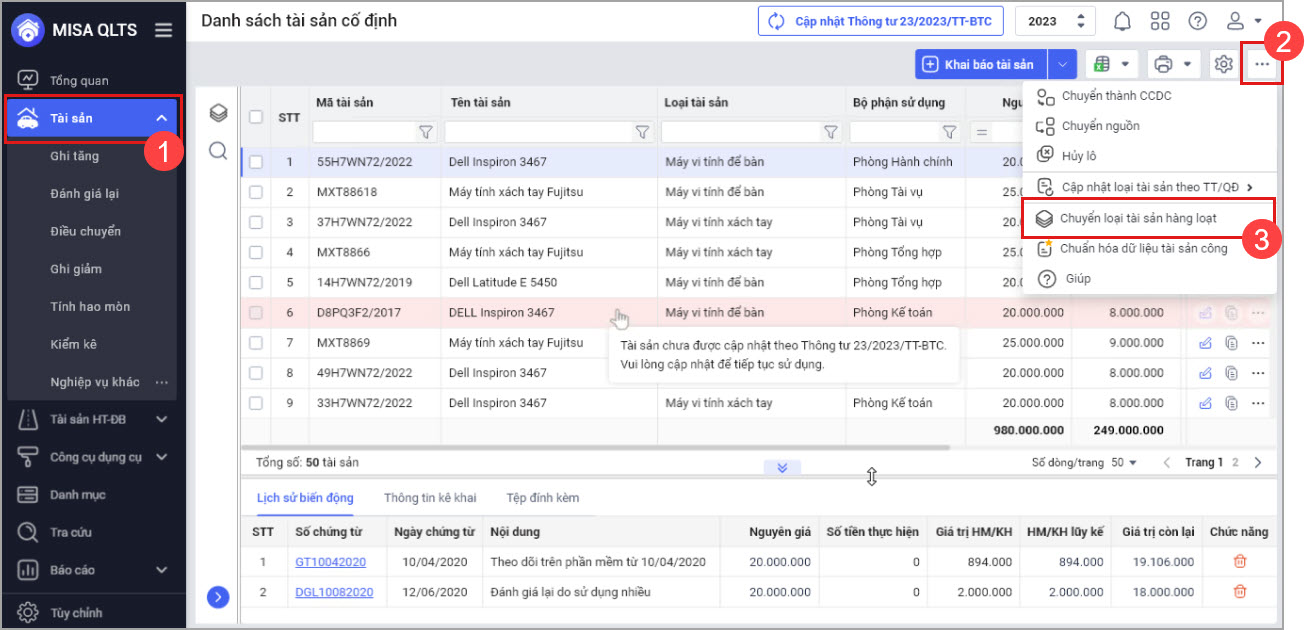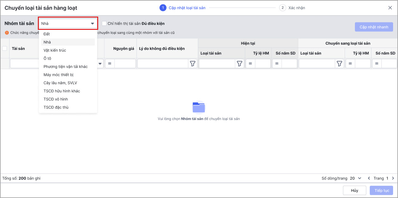 Bước 2: Chọn tài sản cần chuyển loại