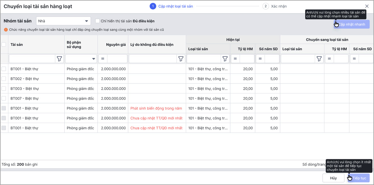 - Cách 2: Hoặc tích chọn nhiều tài sản để cập nhật nhanh loại tài sản