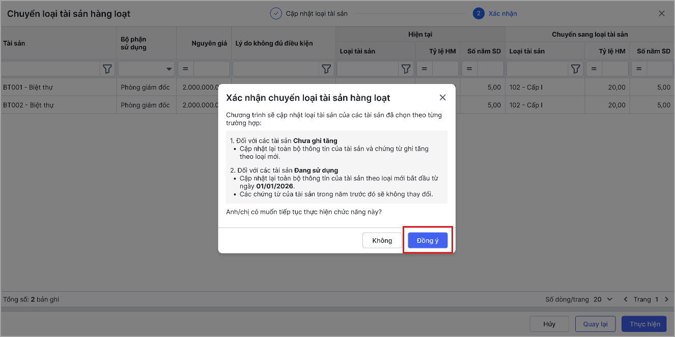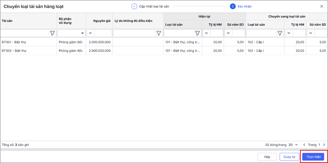 Bước 5: Sau đó chọn Thực hiện để hoàn thành việc chuyển loại tài sản
