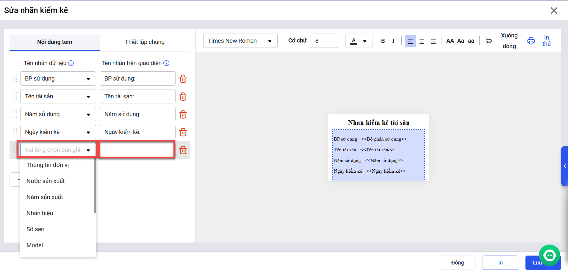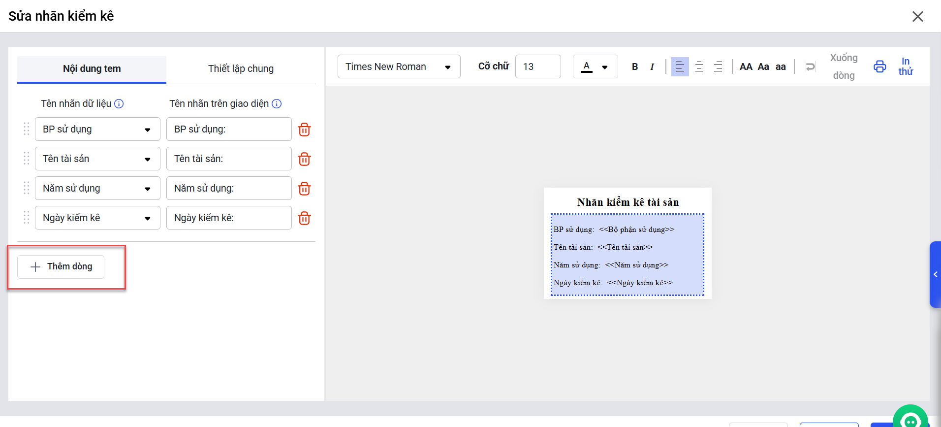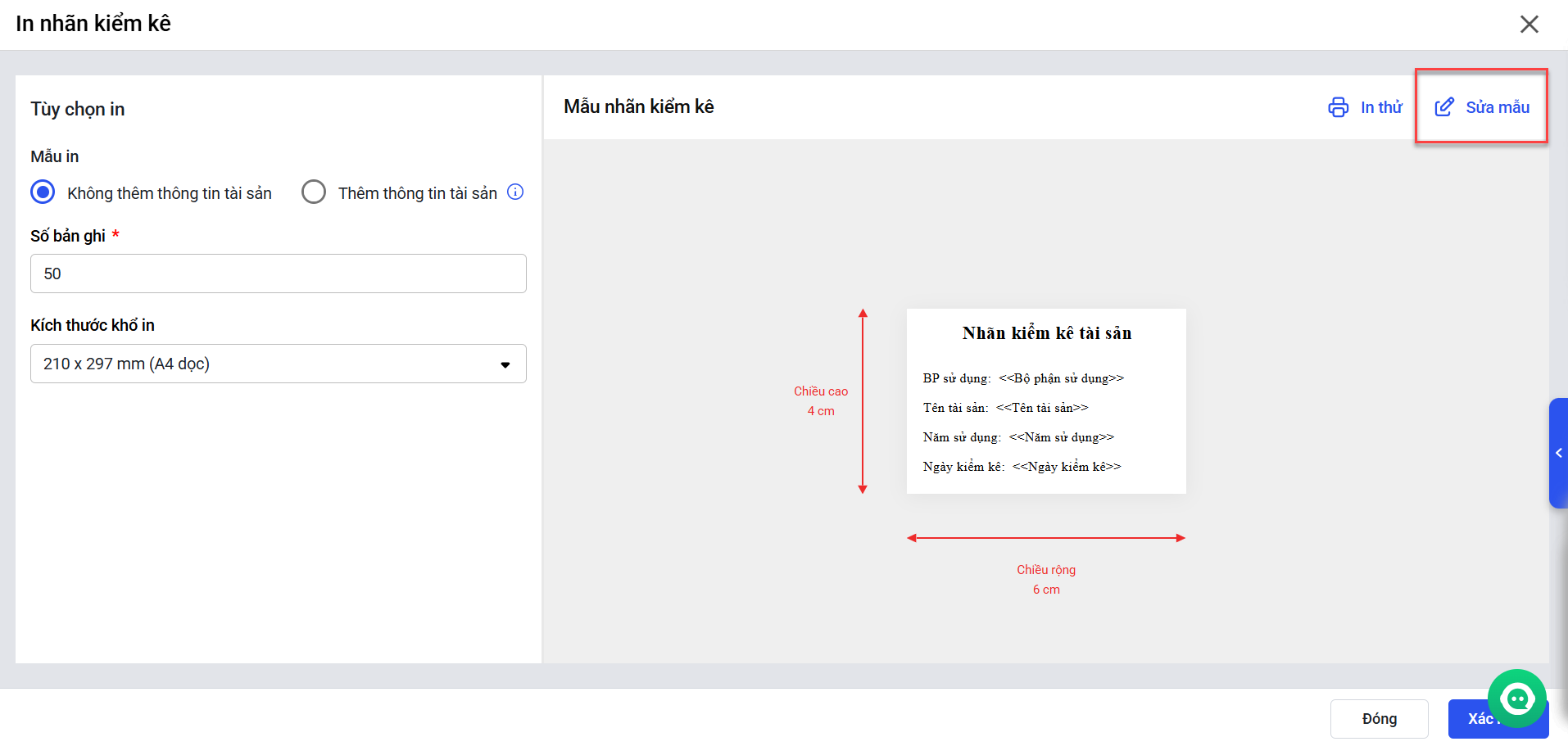 • Tại menu Tổng kiểm kê\Tài sản cố định\In\In nhãn kiểm kê\Sửa mẫu