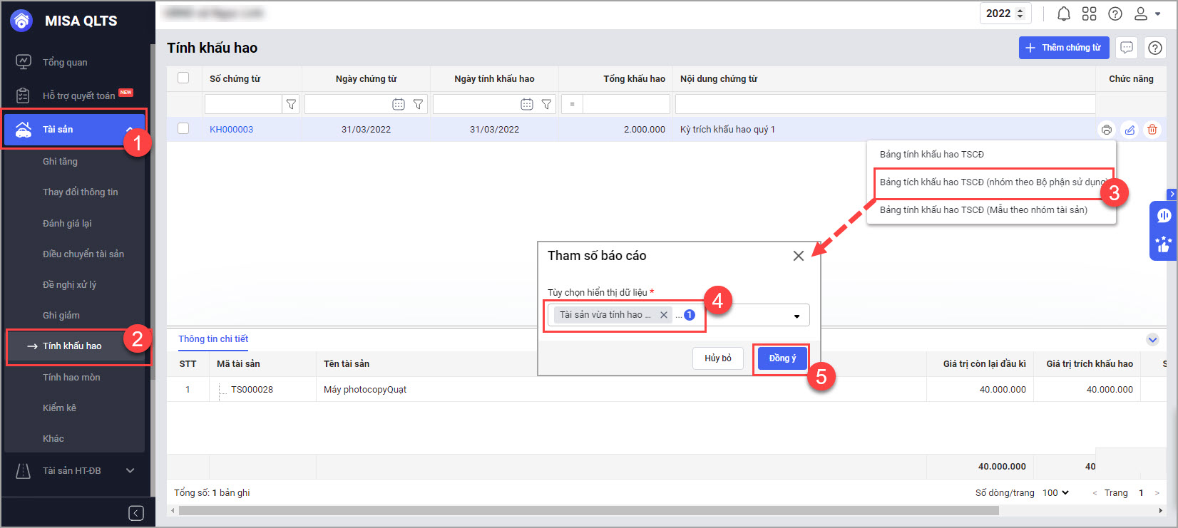 Lưu ý: Phần mềm không hỗ trợ tính khấu hao/hao mòn theo từng phòng ban, khi lập chứng từ hao mòn/khấu hao là tính cho toàn đơn vị.