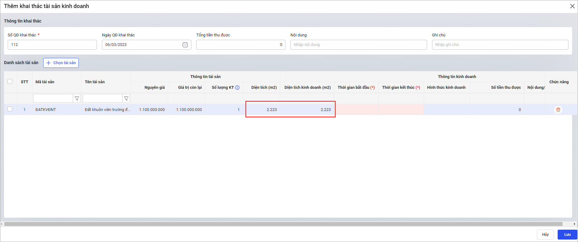 - Khi Thêm tài sản khai thác khác: Phần mềm lấy lên thông tin Diện tích khai thác = Diện tích của tài sản cho phép chỉnh sửa được.