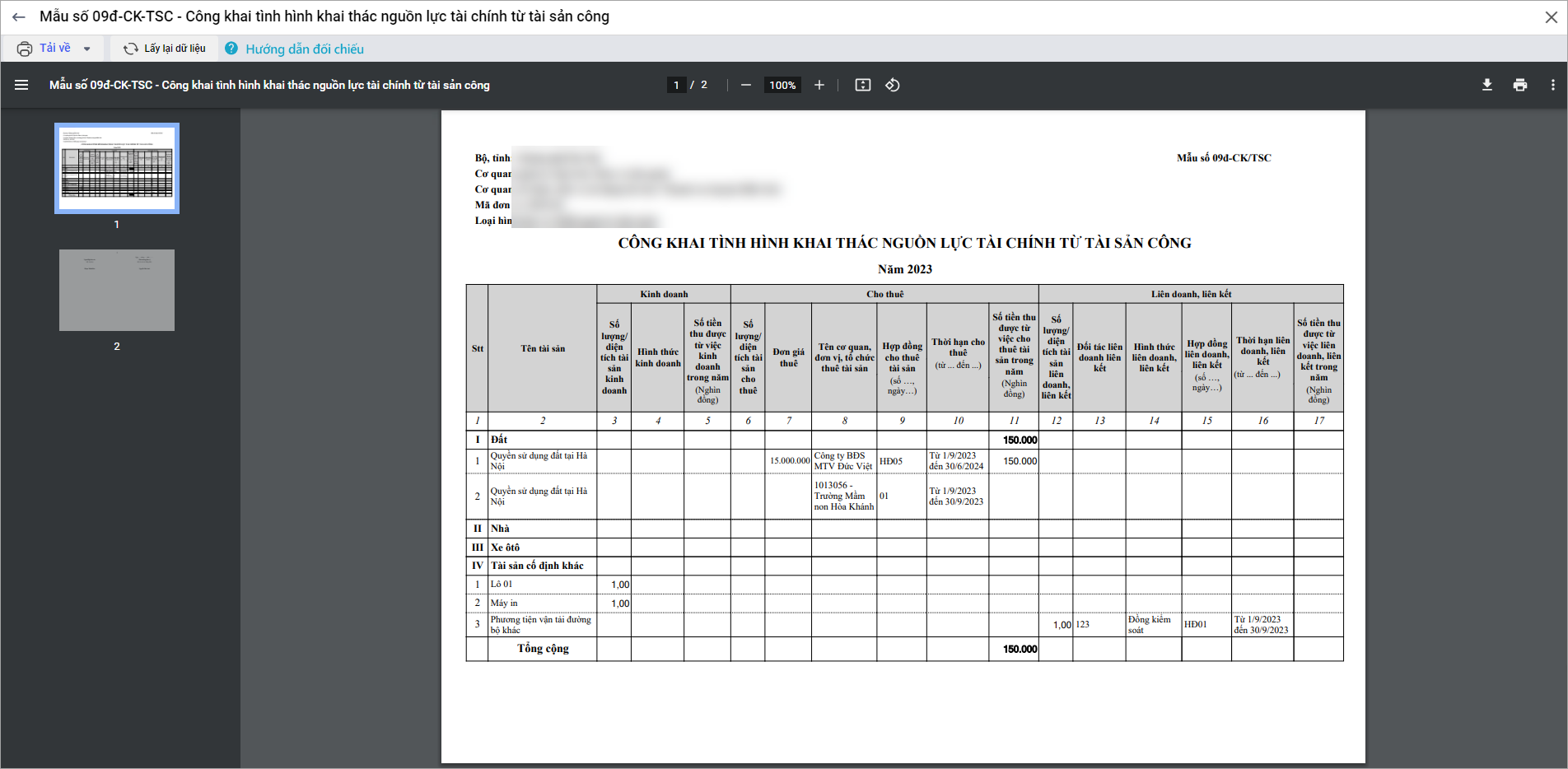 - Tại menu Báo cáo\chọn báo cáo công khai, nhấn mở Mẫu số 10d-CK-TSC Công khai tình hình khai thác nguồn lực tài chính từ tài sản công, phần mềm lấy đúng giá trị diện tích cho thuê của tài sản trên báo cáo.