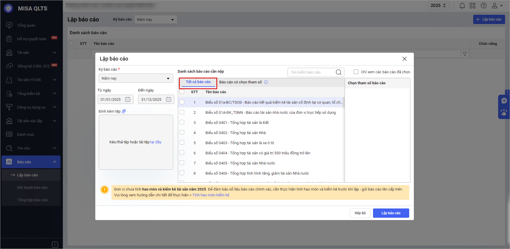 Tại menu Báo cáo\Lập báo cáo: Lập báo cáo hoặc Lập báo cáo bổ sung, phần mềm hiển thị danh sách báo cáo được chia thành tab Tất cả và tab Báo cáo chọn tham số