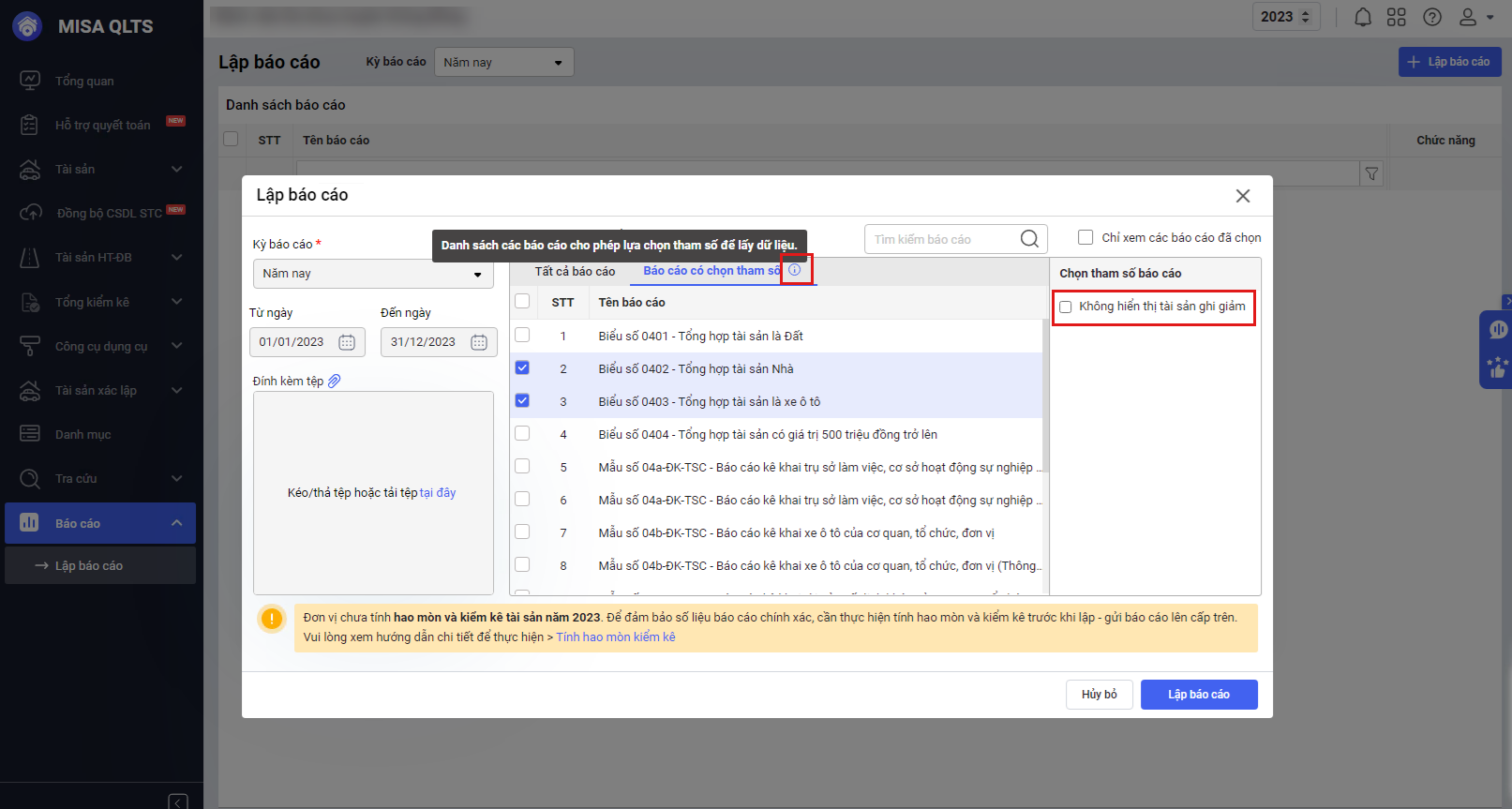 2. Cán bộ IHos Tài sản có thể tự chọn dữ liệu khi lập báo cáo gửi cấp trên, giúp tiết kiệm thời gian hỗ trợ