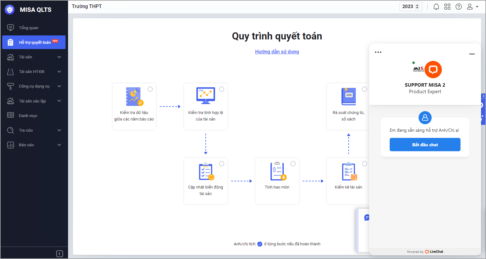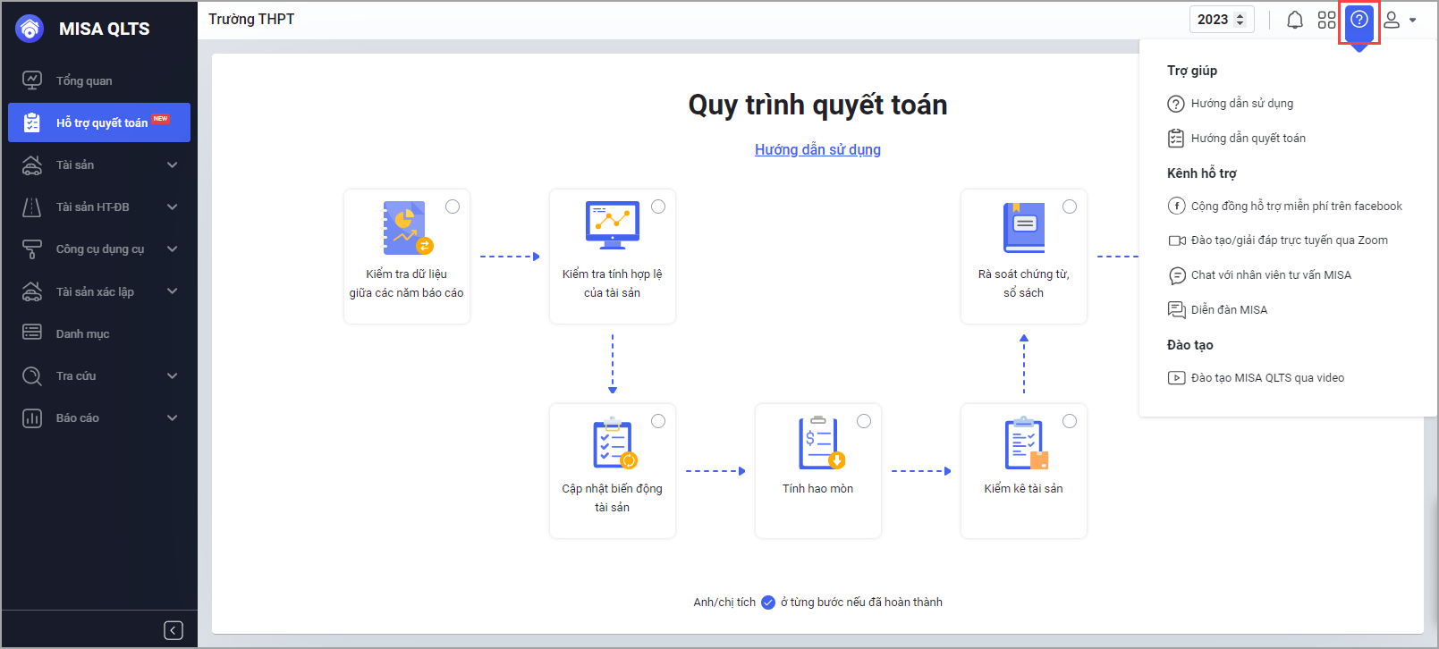 - Hướng dẫn quyết toán: Phần mềm dẫn đến trang Hỗ trợ quyết toán bao gồm video hướng dẫn và tài liệu hướng dẫn.
