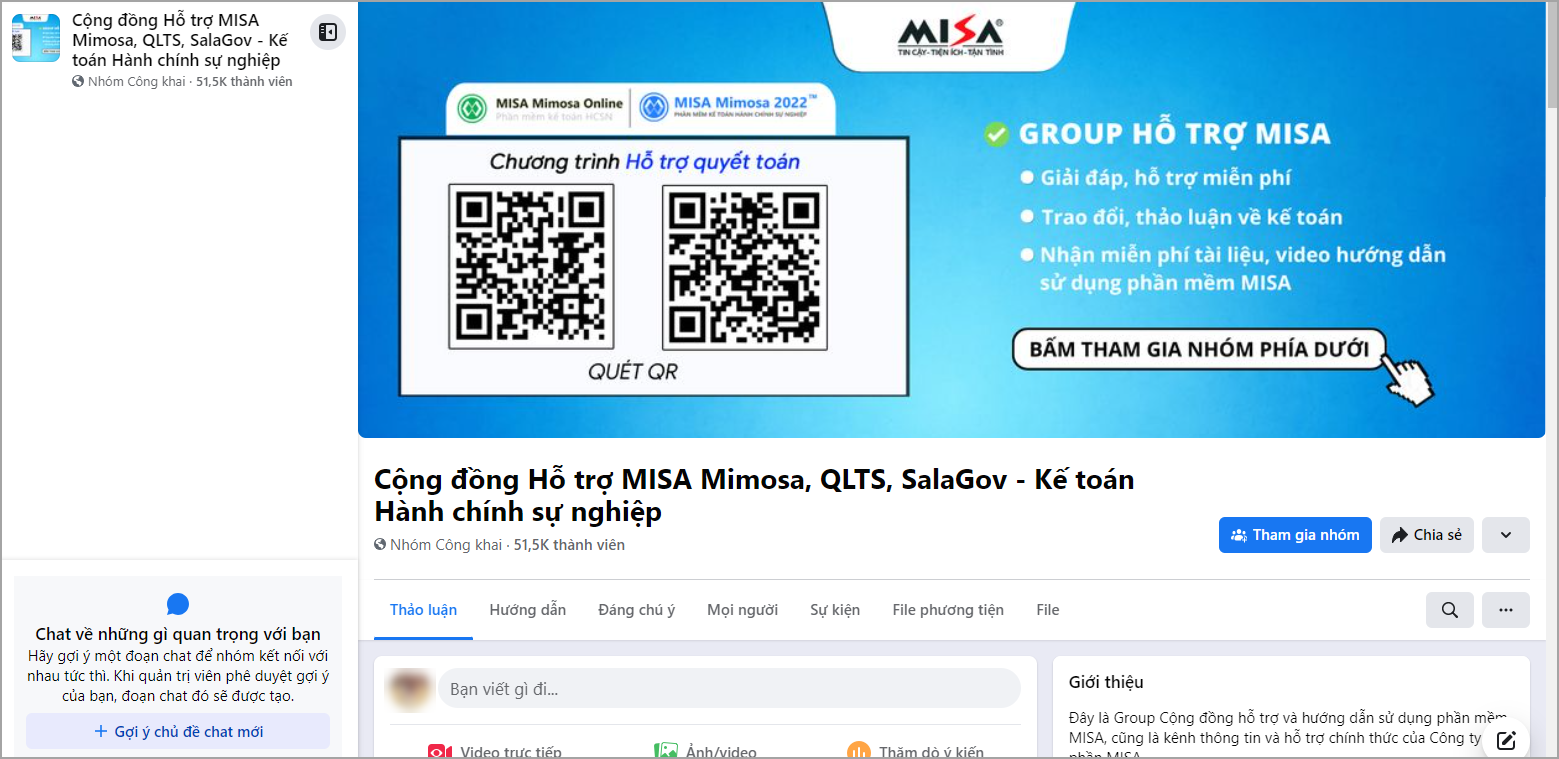 - Cộng đồng hỗ trợ miễn phí trên Facebook: Phần mềm dẫn đến nhóm trên Facebook – nơi anh/chị có thể hỏi/giải đáp các vướng mắc khi sử dụng phần mềm. Chọn Tham gia nhóm, sau khi được quản trị viên duyệt, anh/chị có thể đăng bài, bình luận và trao đổi trong nhóm.