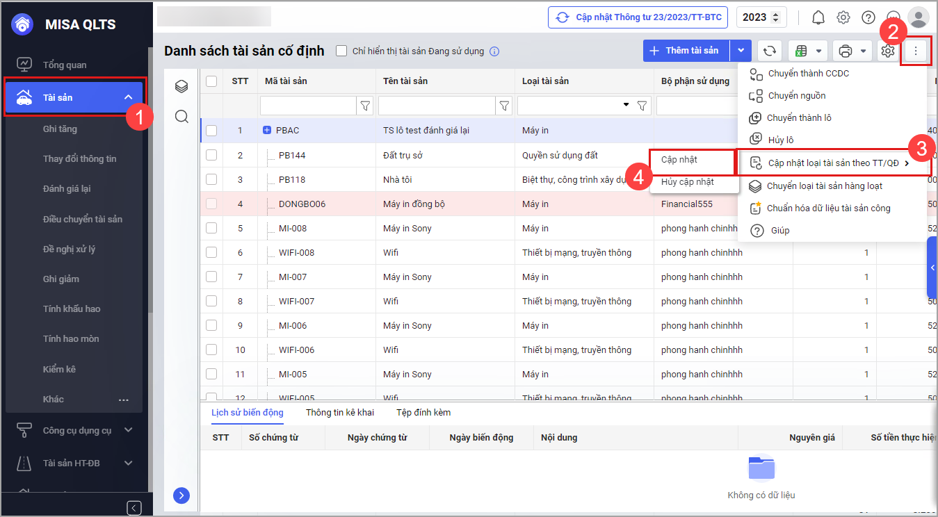 - Tại menu Tài sản\Tùy chọn\Cập nhật loại tài sản theo TT/QĐ\Cập nhật