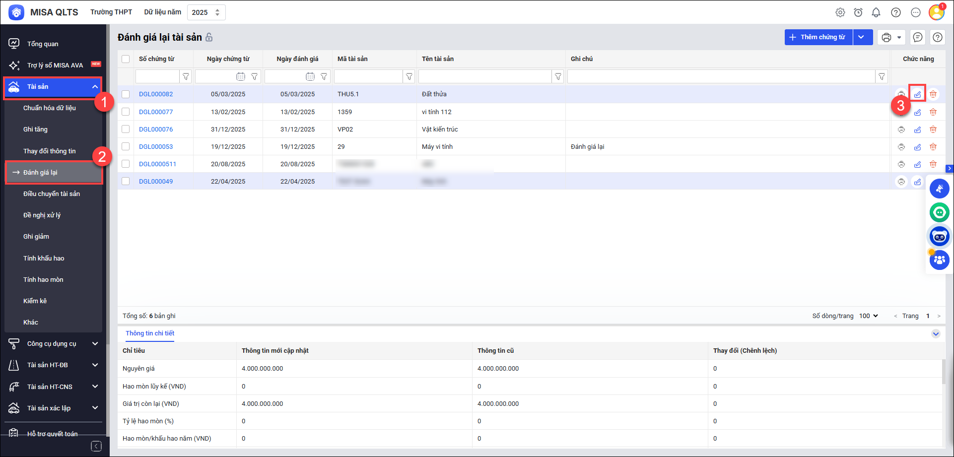 • Vào Tài sản/Đánh giá lại. Nhấn vào biểu tượng chiếc bút để thực hiện đánh giá lại tài sản