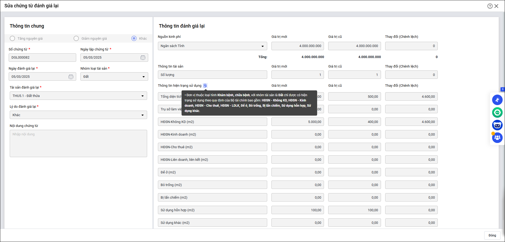 Bài viết hướng dẫn cán bộ QLTS chọn hiện trạng sử dụng phù hợp với loại hình đơn vị khi thực hiện đánh giá lại, thay đổi thông tin tài sản.