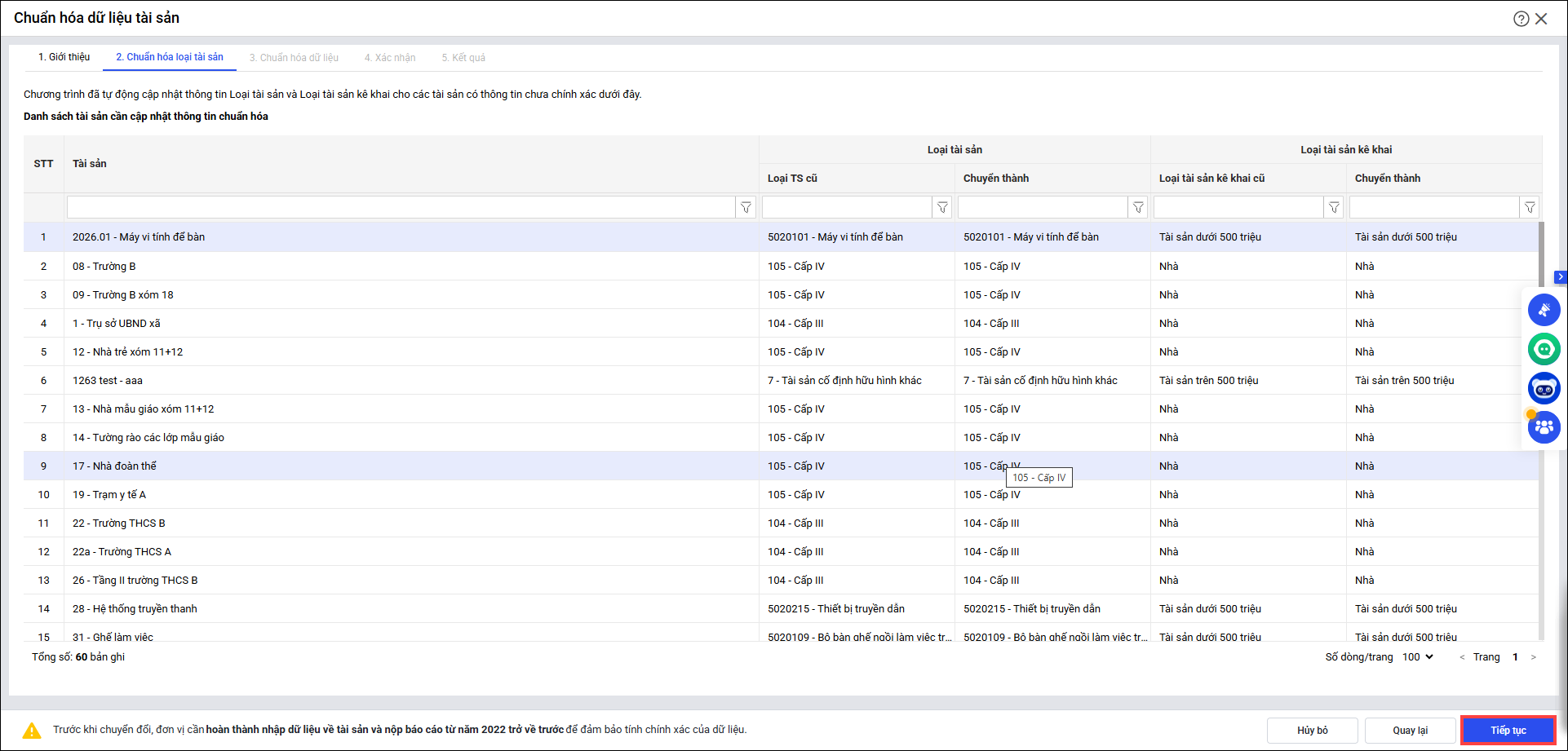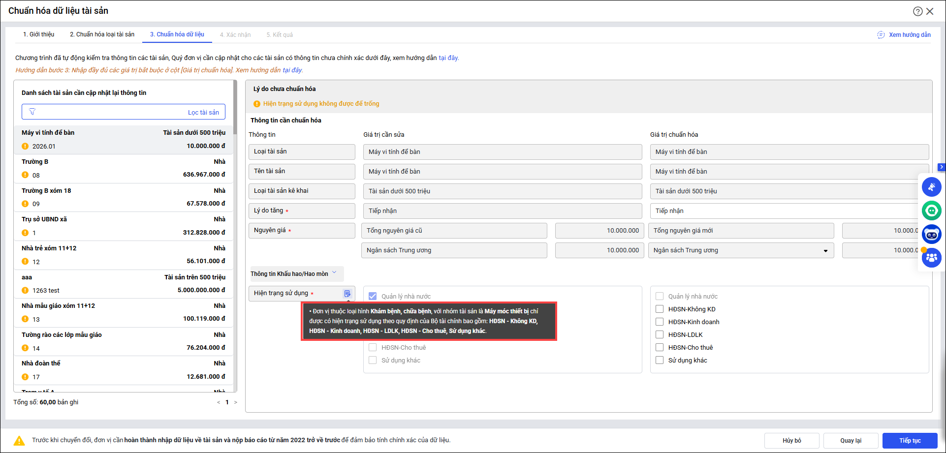 1. Tại màn hình Chuẩn hóa dữ liệu tài sản