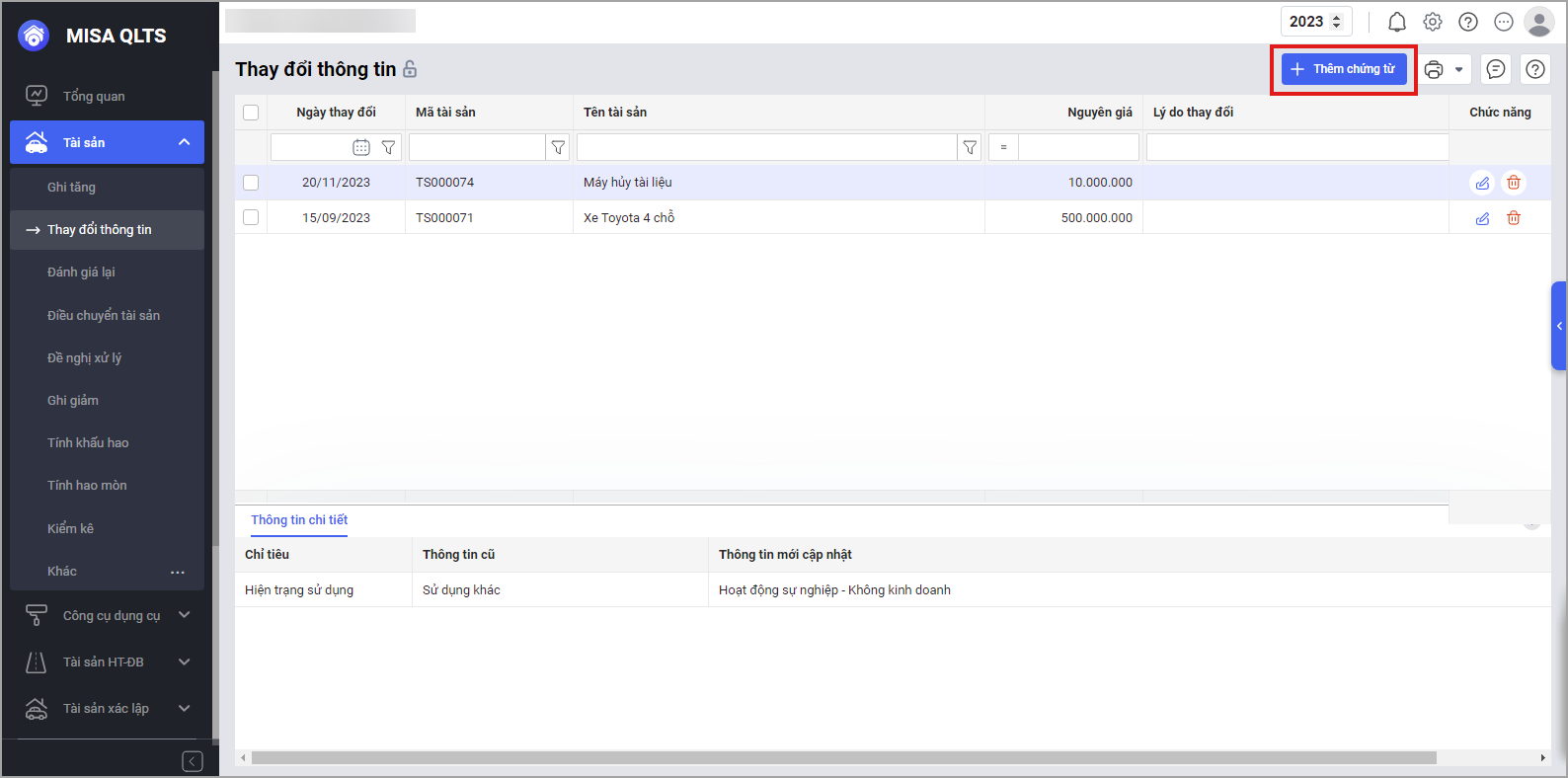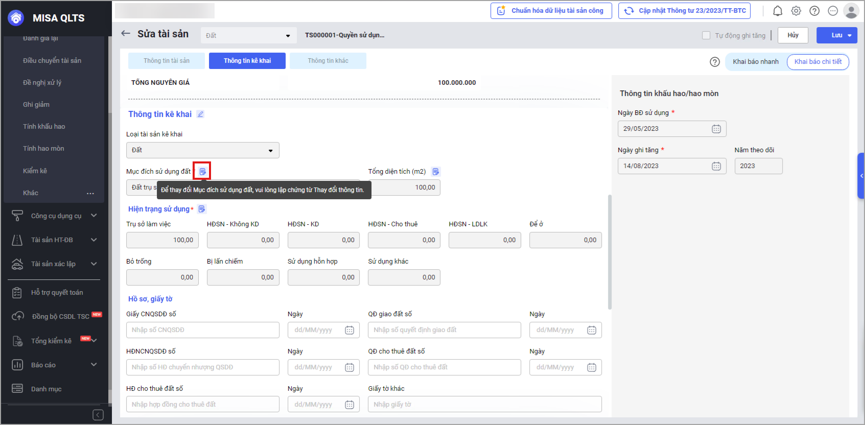 Khi tài sản là Đất thiếu Mục đích sử dụng đất, anh/chị sẽ được hướng dẫn cụ thể để bổ sung thông tin này. Tại menu Tài sản\Sửa tài sản, anh/chị lập chứng từ thay đổi thông tin, nhấn Thêm chứng từ thay đổi mục đích sử dụng đất.