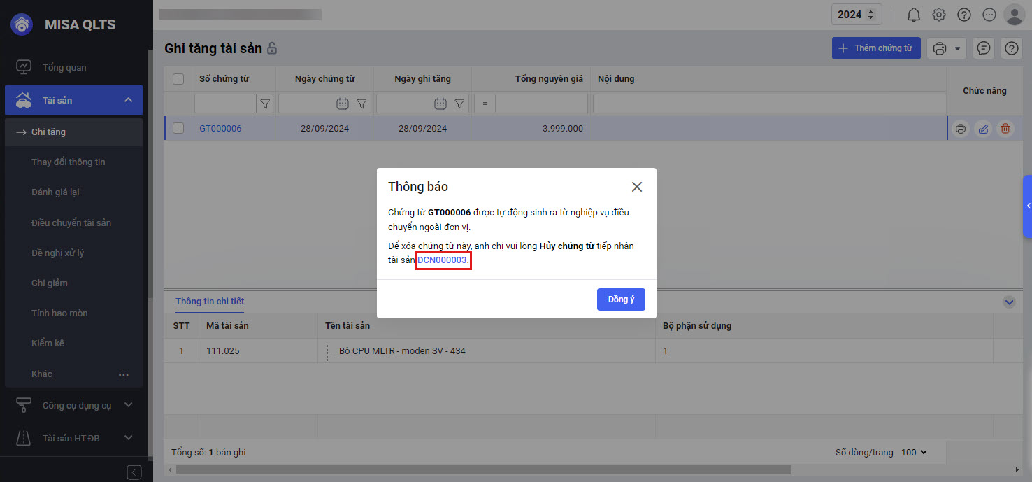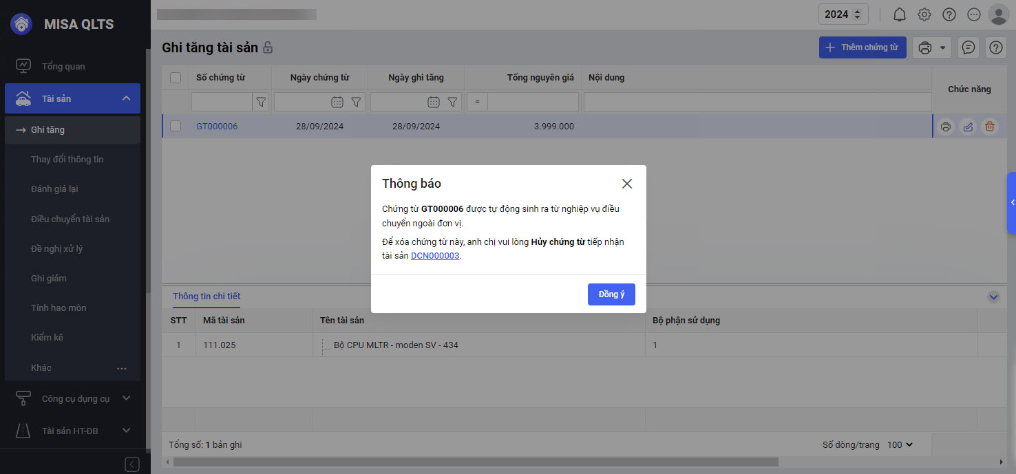 Khi xóa chứng từ ghi tăng tự động sinh ra do tiếp nhận từ đơn vị khác chương trình sẽ hiển thị thông báo: Chứng từ được tự động sinh ra từ nghiệp vụ điều chuyển ngoài đơn vị. Để xóa chứng từ này, anh/chị vui lòng Hủy chứng từ tiếp nhận tài sản.