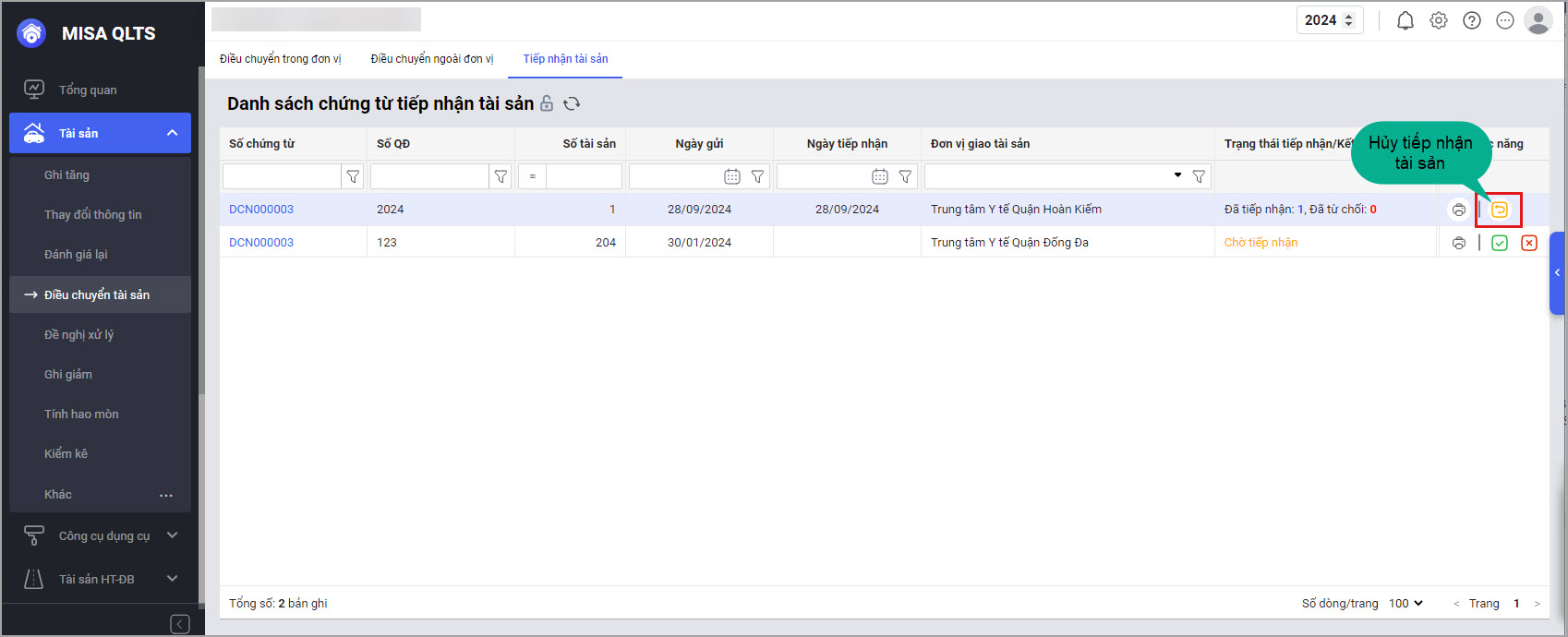 Phần mềm sẽ đi đến chứng từ tiếp nhận tài sản, tại chứng từ tiếp nhận tài sản anh/chị nhấn Hủy tiếp nhận.