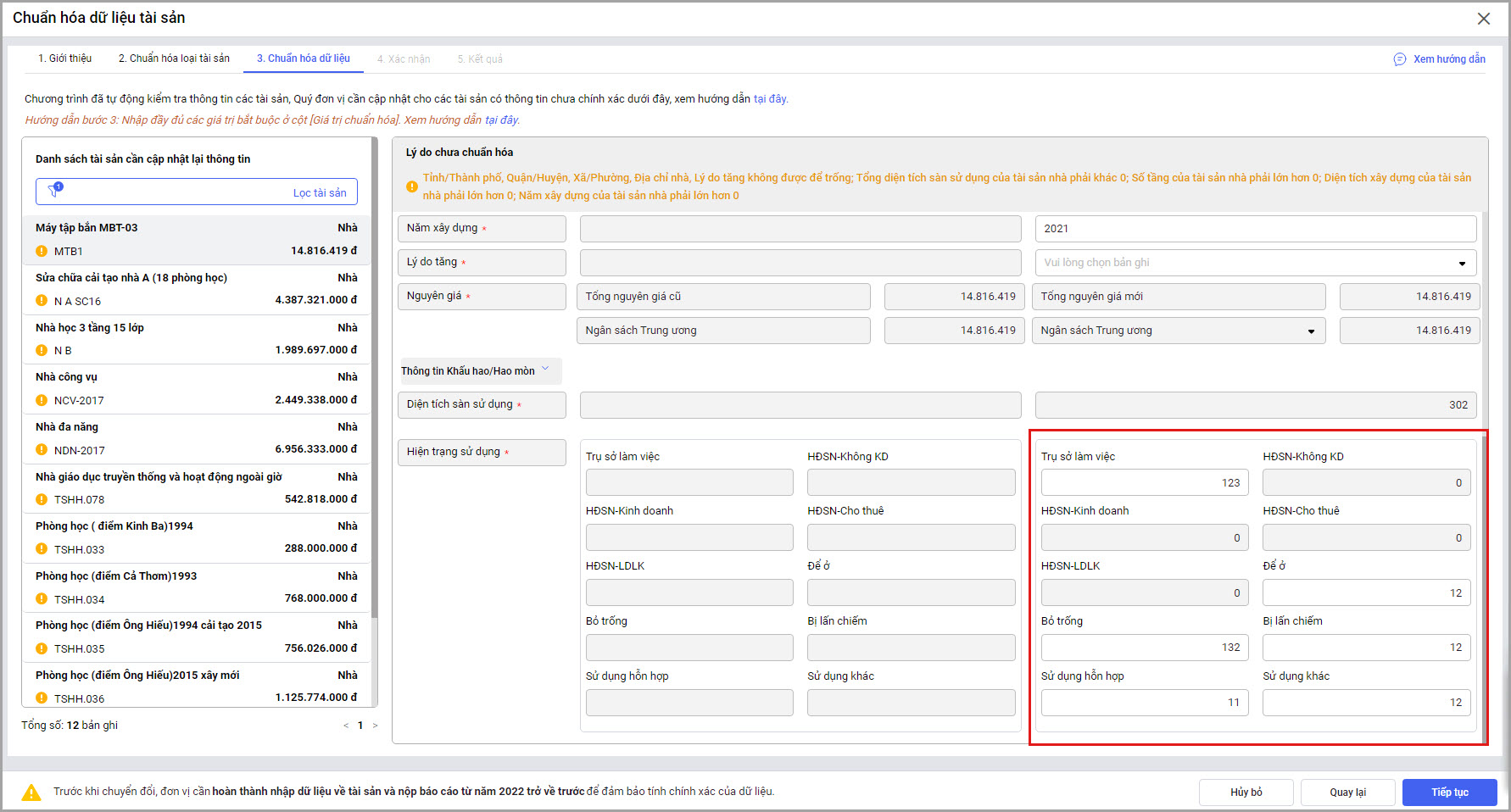 • Tại menu Tài sản\Chuẩn hóa dữ liệu tài sản công\Chuẩn hóa từng tài sản: tại Bước 3: Chuẩn hóa dữ liệu