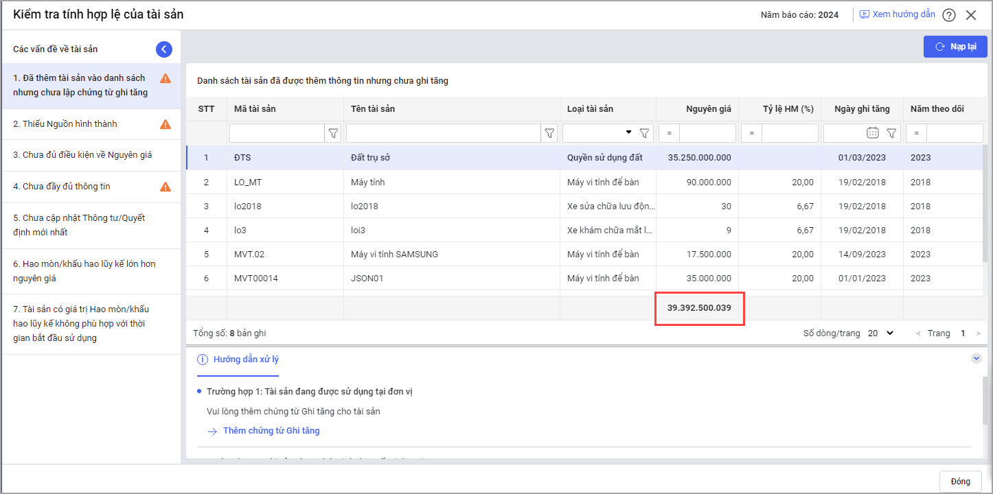• Anh chị có thể xem được tổng nguyên giá tài sản bị lệch theo từng vấn đề khi thực hiện kiểm tra báo cáo và rà soát chứng từ, sổ sách.