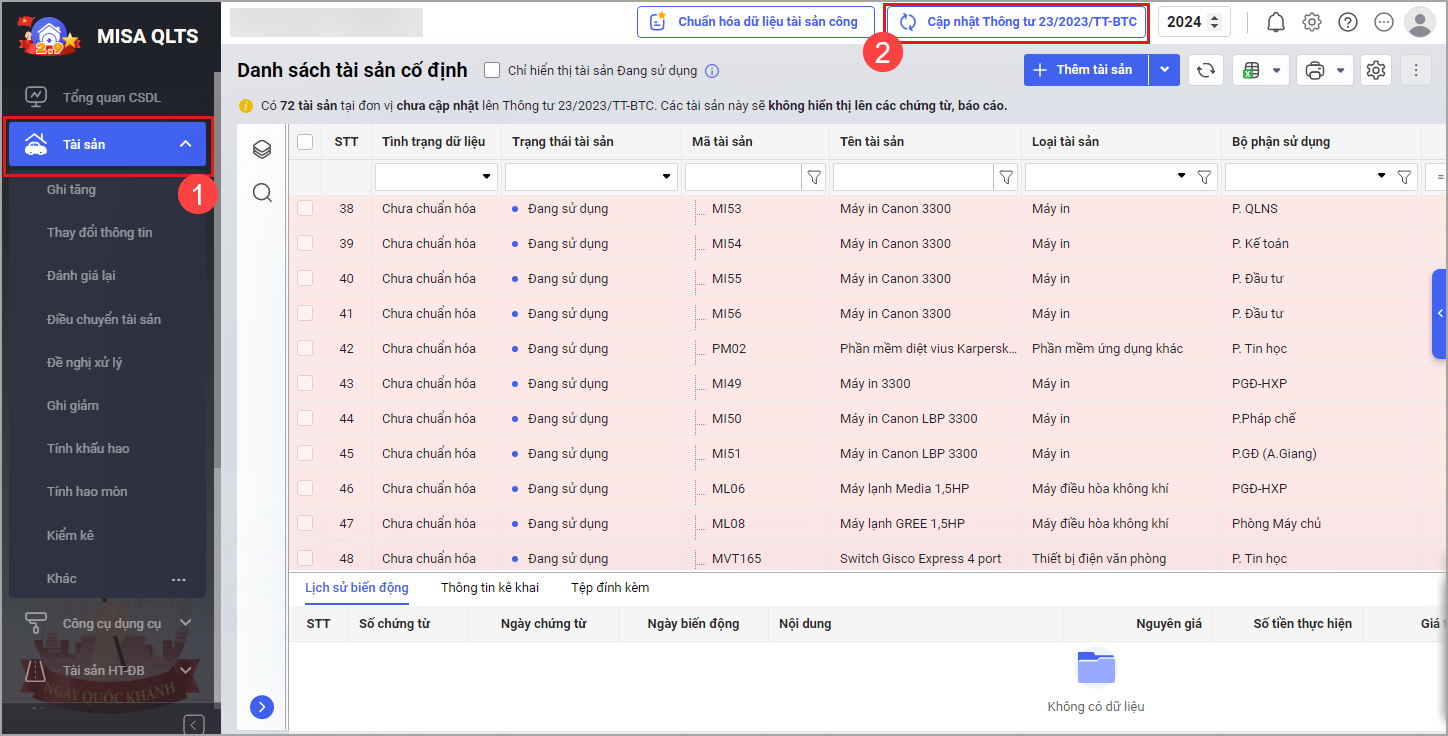 Bước 1: Tại menu Tài sản\Cập nhật tài sản theo TT/QĐ.