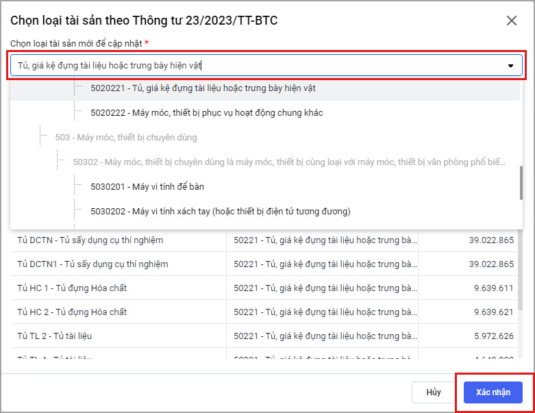 Bước 4: Chọn Loại tài sản, sau đó chọn Xác nhận.