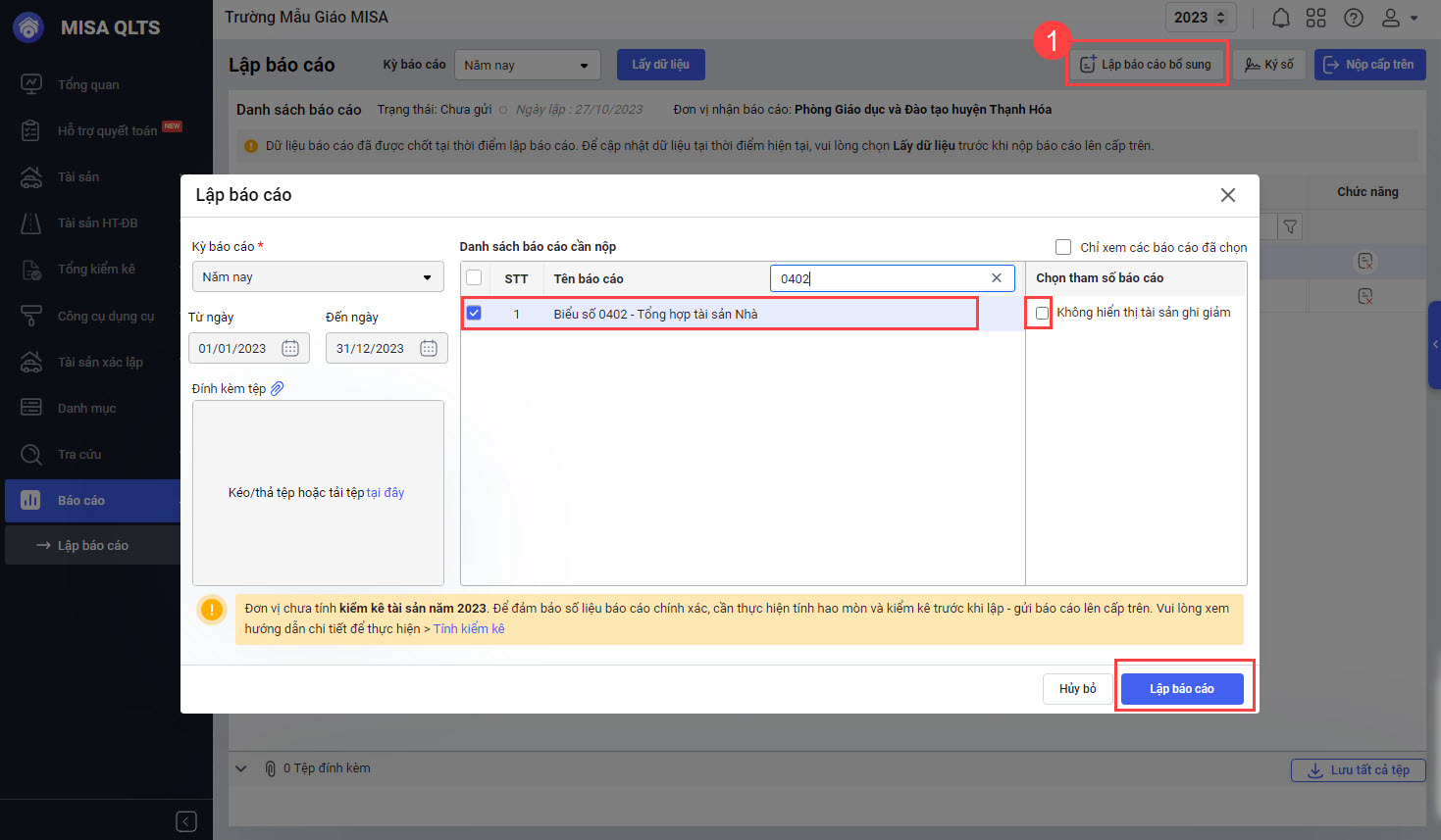 Cuối năm cán bộ QLTS cần nộp các báo cáo kê khai tình hình tài sản tại đơn vị lên cấp chủ quản để đơn vị thực hiện tổng hợp số liệu. Trong đó có báo cáo Biểu số 0402 – Tổng hợp tài sản Nhà.