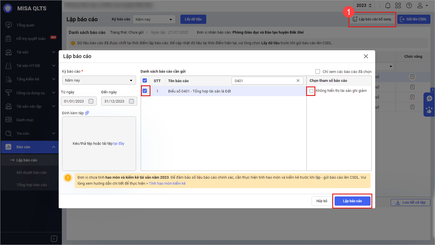 - Khi lập biểu số 0401 – Tổng hợp tài sản là đất: Phần mềm hiển thị thêm lựa chọn Không hiển thị tài sản ghi giảm, khi tích chọn phần mềm sẽ lấy lên các tài sản đang sử dụng đến cuối kỳ báo cáo tại đơn vị đến cuối năm (không bao gồm các tài sản đã ghi giảm).
