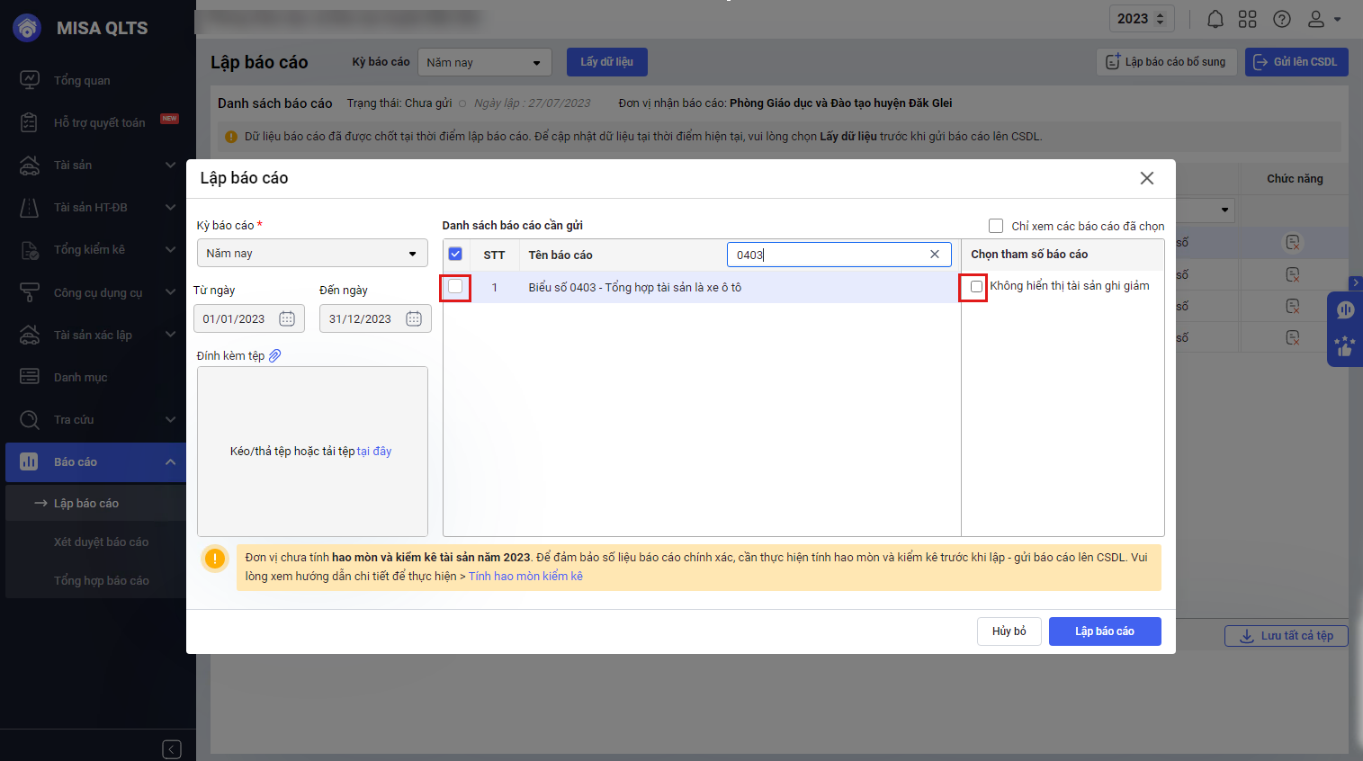 - Khi lập biểu số 0403 – Tổng hợp tài sản là xe ô tô: Phần mềm hiển thị thêm lựa chọn Không hiển thị tài sản ghi giảm, khi tích chọn phần mềm sẽ lấy lên các tài sản đang sử dụng đến cuối kỳ báo cáo tại đơn vị đến cuối năm (không bao gồm các tài sản đã ghi giảm