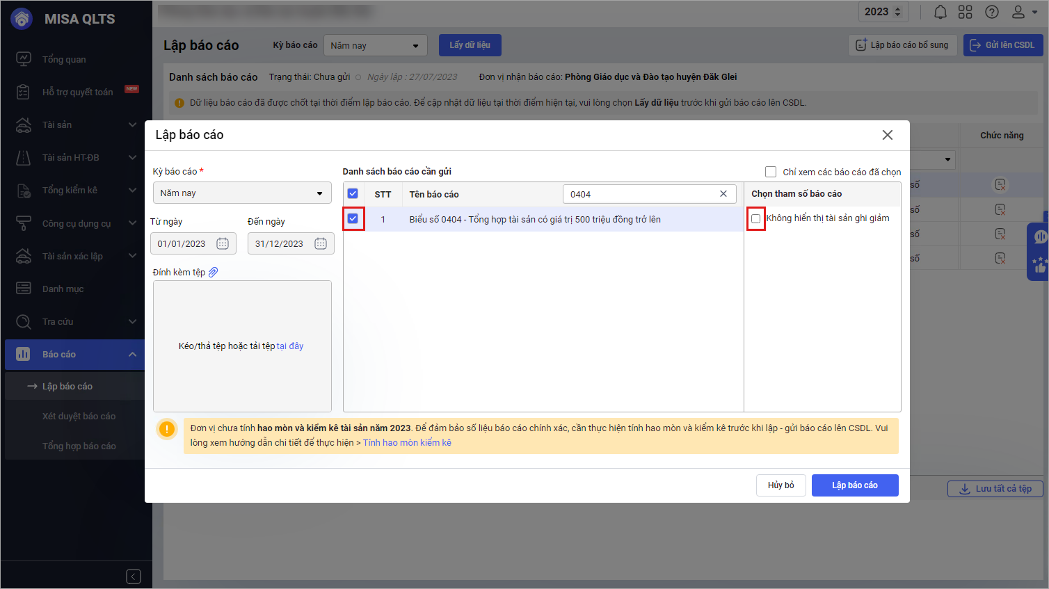 - Khi lập biểu số 0401 – Tổng hợp tài sản có giá trị 500 triệu đồng trờ lên: Phần mềm hiển thị thêm lựa chọn Không hiển thị tài sản ghi giảm, khi tích chọn phần mềm sẽ lấy lên các tài sản đang sử dụng đến cuối kỳ báo cáo tại đơn vị đến cuối năm (không bao gồm các tài sản đã ghi giảm).