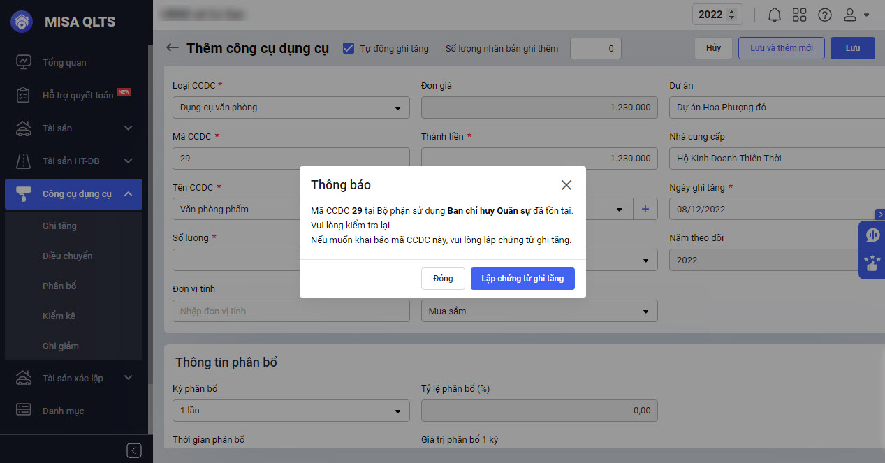 Bước 1: Tại Menu Công cụ dụng cụ\Khai báo CCDC: Mã CCDC Phòng ban là riêng biệt nếu phát hiện trùng mã sau khi thêm CCDC thì phần mềm sẽ hiển thị cảnh báo. Anh/chị nhấn Đóng sau đó tiến hành sửa lại mã CCDC.