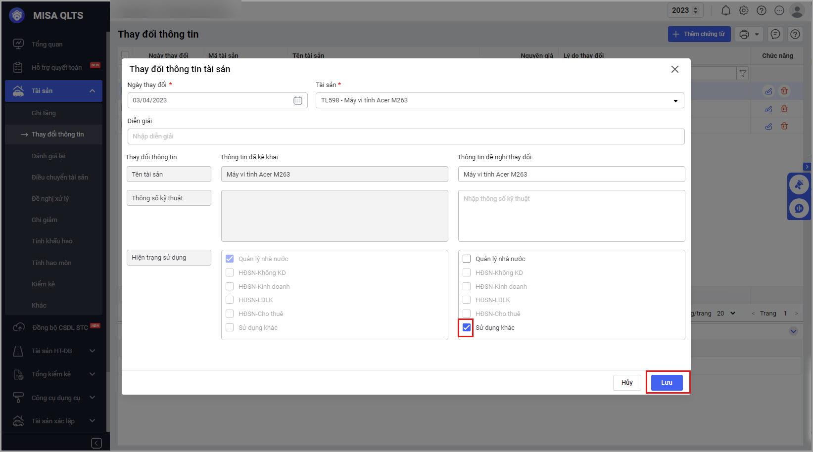 - Thay đổi thông tin Hiện trạng sử dụng cho các tài sản trong lô
