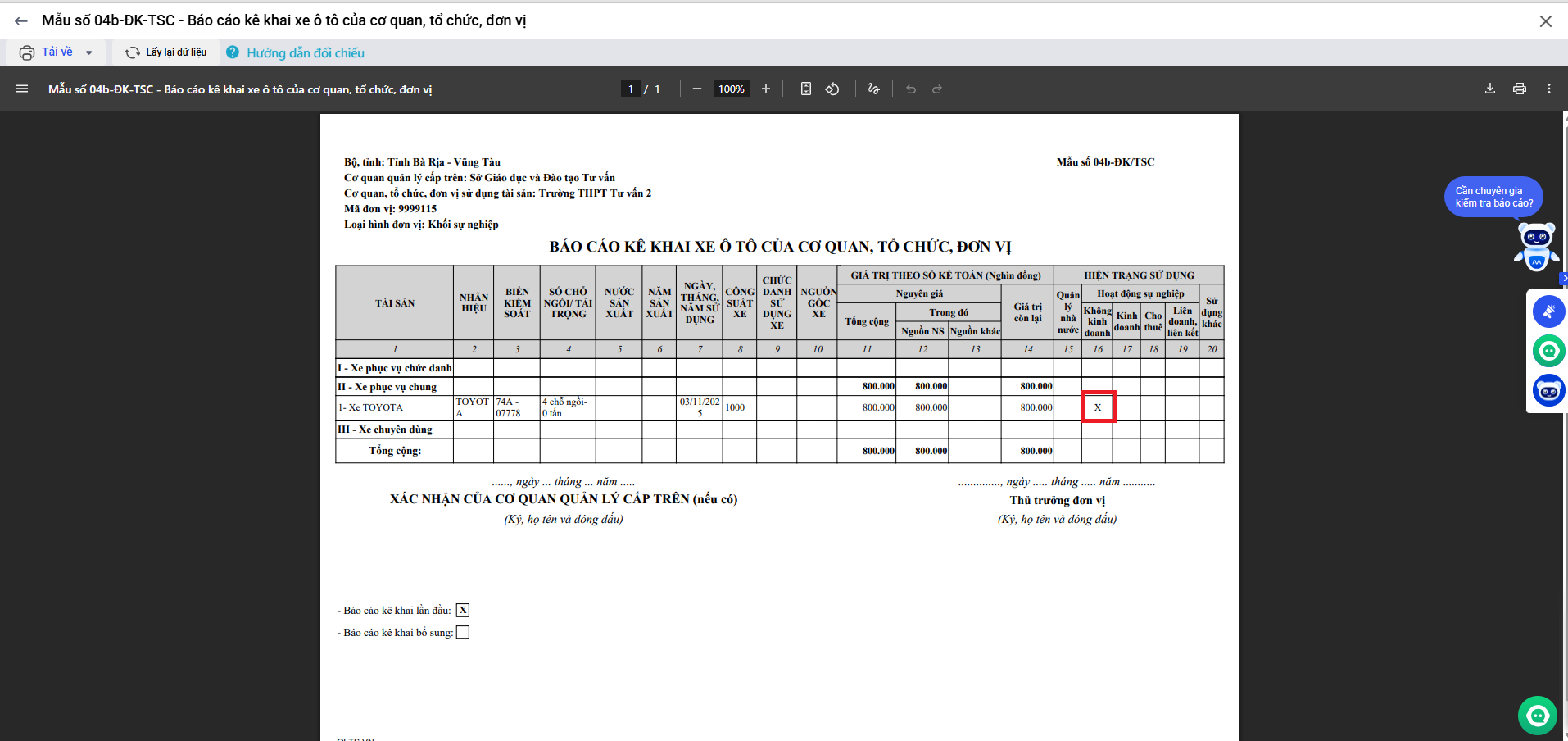- Mẫu số 04b-ĐK-TSC-Báo cáo kê khai xe ô tô của cơ quan, tổ chức, đơn vị.