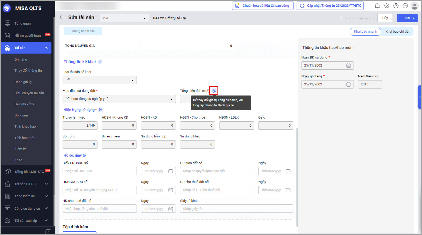 • Tại màn hình Danh sách tài sản cố định\Thay đổi thông tin: Đối với tài sản là đất: Nếu anh/chị muốn thay đổi thông tin Diện tích tài sản đất, nếu muốn tiếp tục thay đổi Diện tích sàn sử dụng anh/chị tiến hành lập chứng từ đánh giá lại.