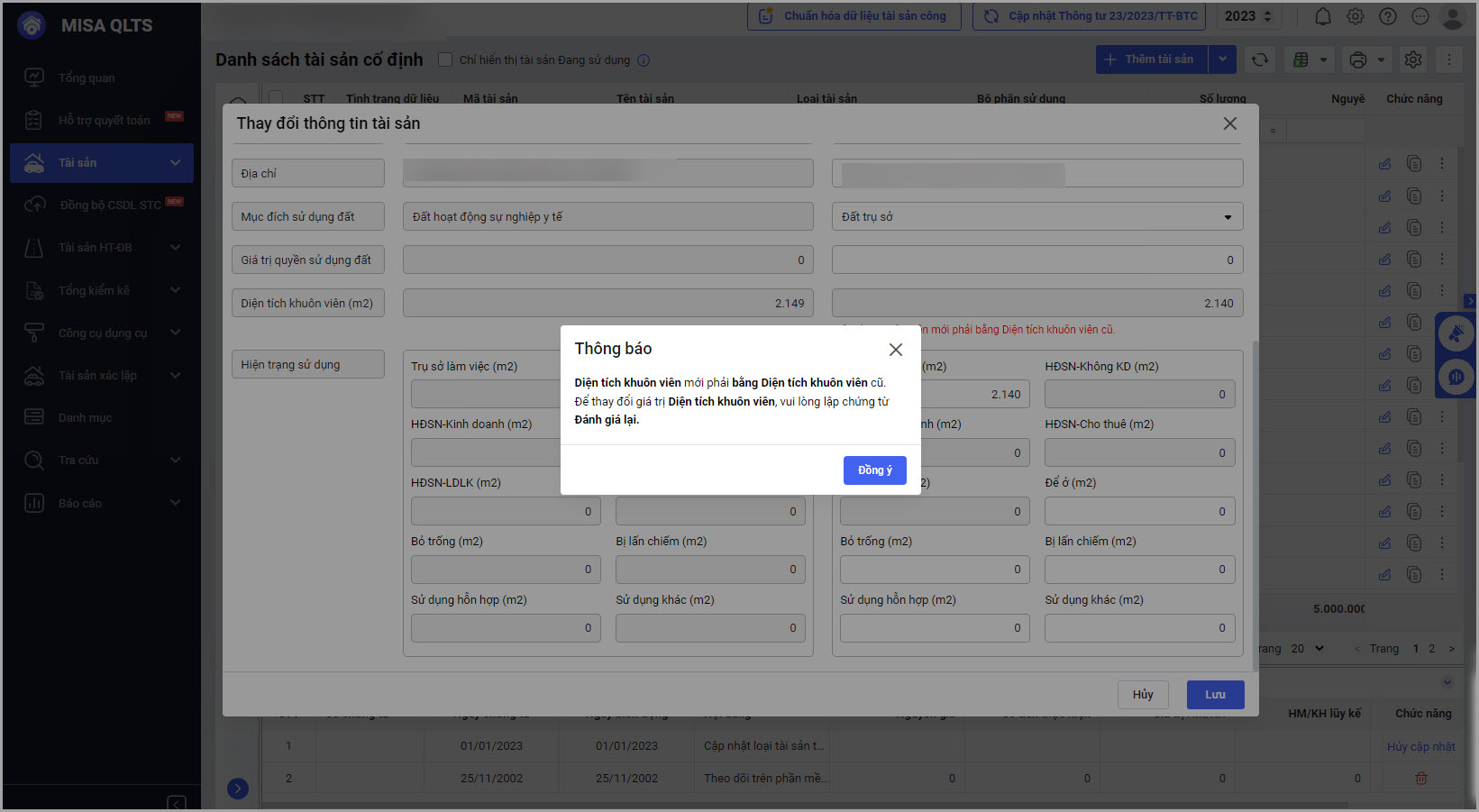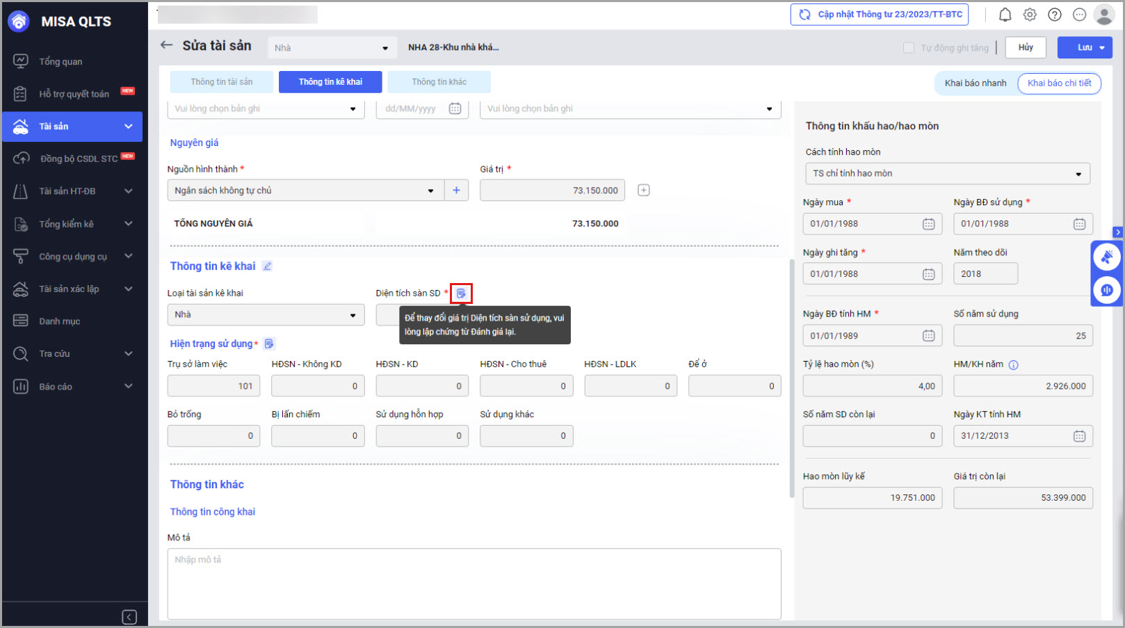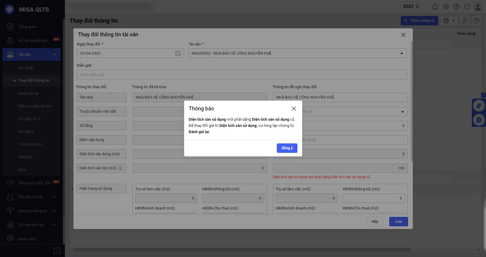 • Tại màn hình Danh sách tài sản cố định\Thay đổi thông tin: Đối với tài sản là nhà: Nếu anh/chị muốn thay đổi thông tin Diện tích sàn sử dụng, phần mềm sẽ hiển thị thông báo, nếu muốn tiếp tục thay đổi Diện tích sàn sử dụng anh/chị tiến hành lập chứng từ đánh giá lại.