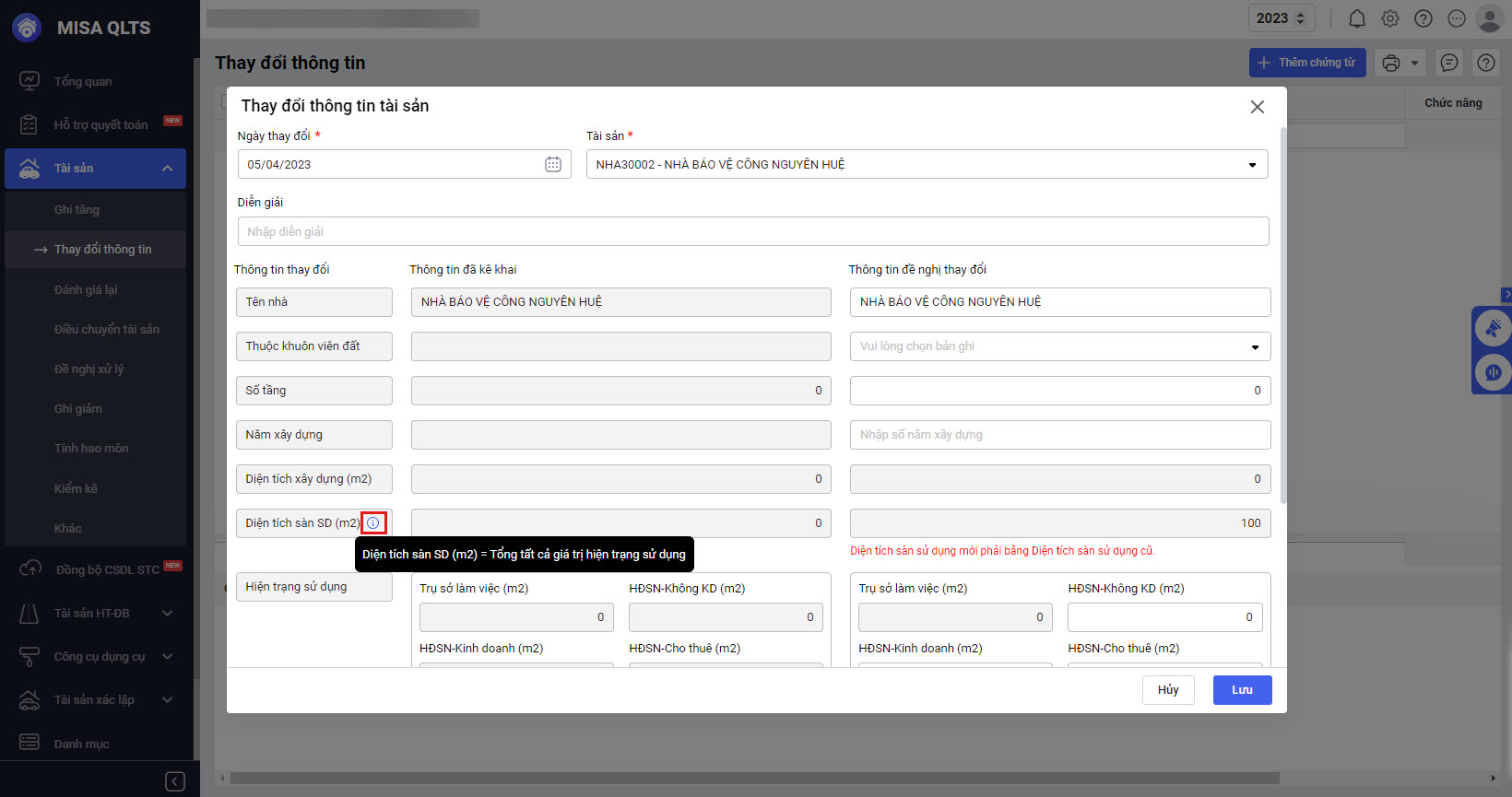 • Tại màn hình Tài sản\Thay đổi thông tin, phần mềm đáp ứng lập chứng từ thay đổi thông tin để thay đổi hiện trạng sử dụng. Trong đó: Đối với tài sản là Đất, Nhà thì Tổng hiện trạng sử dụng mới = Tổng hiện trạng sử dụng cũ = Tổng diện tích sàn sử dụng.
