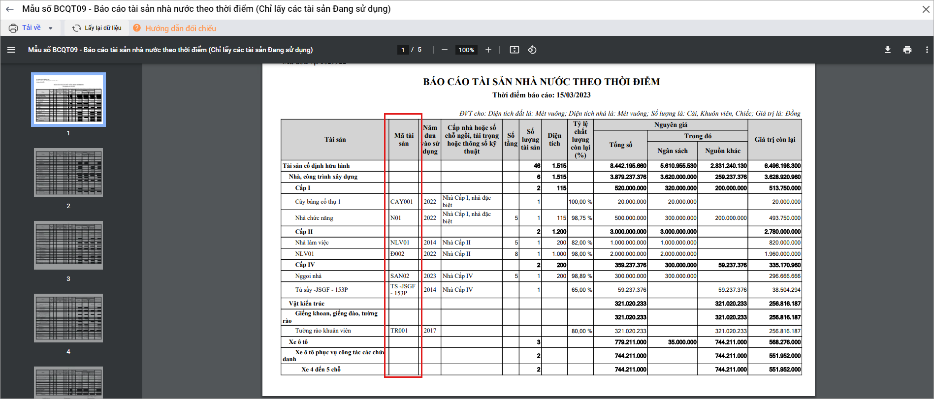 2.2. Mẫu số BCQT09 – Báo cáo tài sản nhà nước theo thời điểm (Chỉ lấy các tài sản Đang sử dụng)
