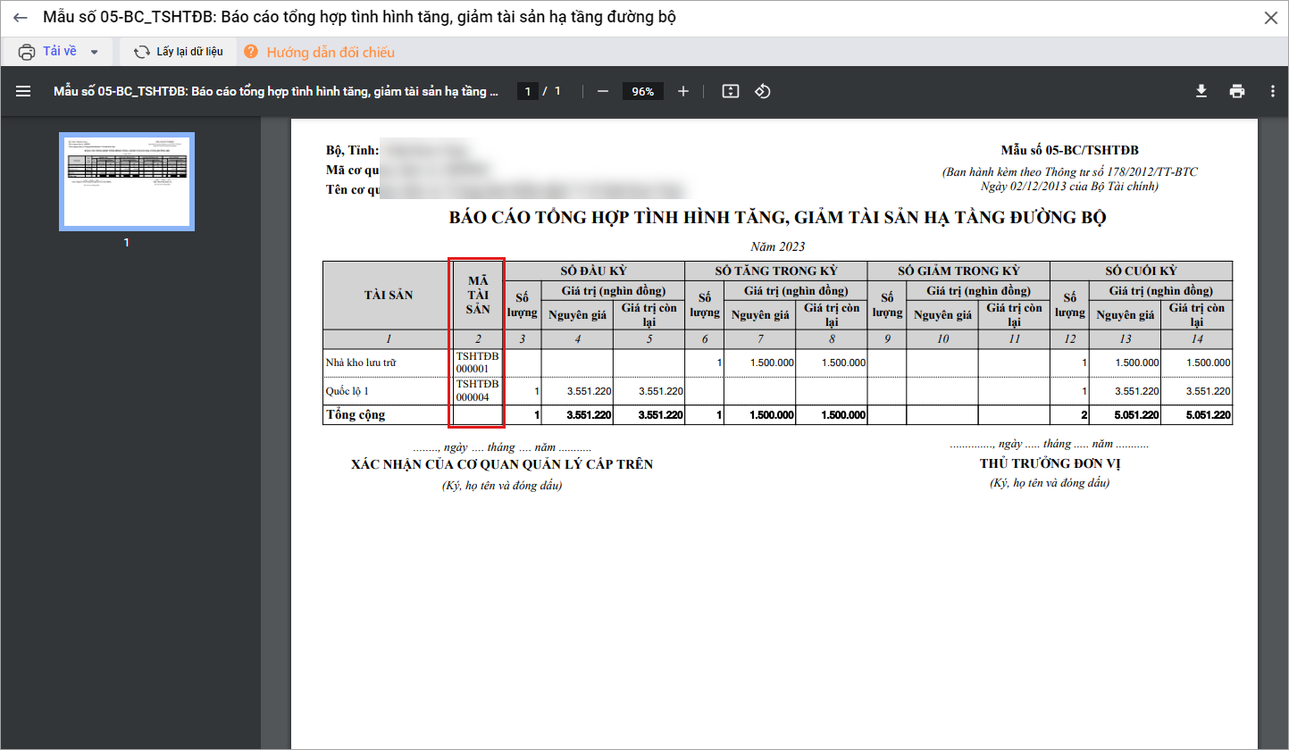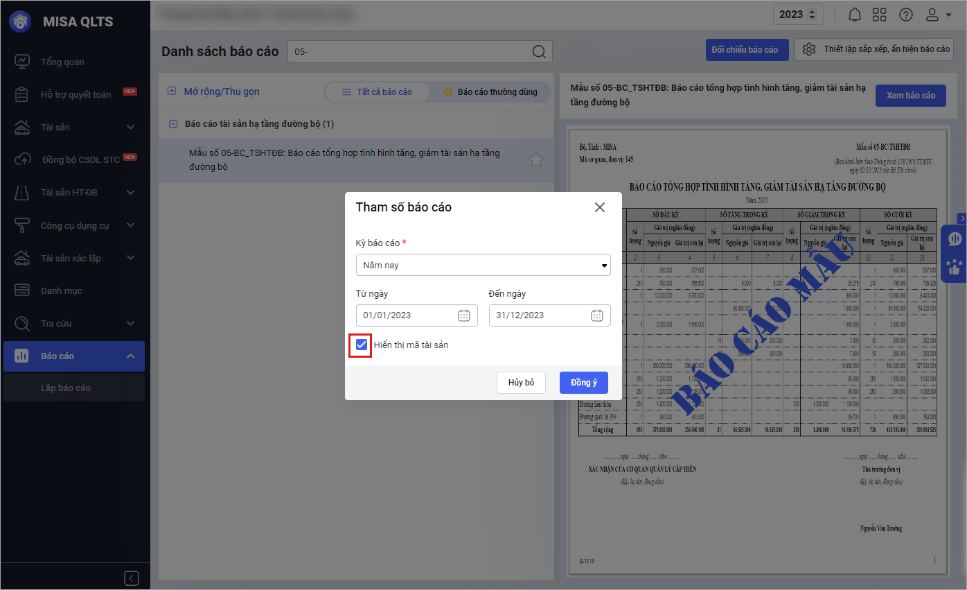 - Tại Báo cáo\Mẫu số 05-BC_TSHTĐB: Báo cáo tổng hợp tình hình tăng, giảm tài sản hạ tầng đường bộ: Màn hình tham số báo cáo bổ sung thêm lựa chọn Hiển thị mã tài sản.