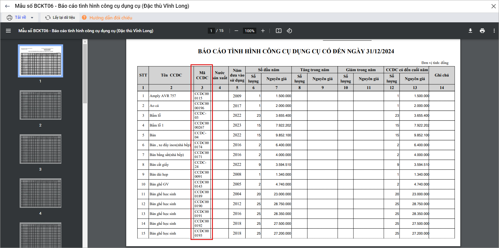 2.3. Mẫu số BCKT06 – Báo cáo tình hình công cụ dụng cụ (Đặc thù Vĩnh Long)