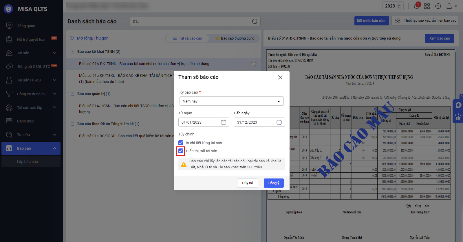 - Tại Báo cáo\Biểu số 01A-ĐK_TSNN – Báo cáo tài sản nhà nước của đơn vị trực tiếp sử dụng: Màn hình tham số báo cáo bổ sung thêm lựa chọn Hiển thị mã tài sản.