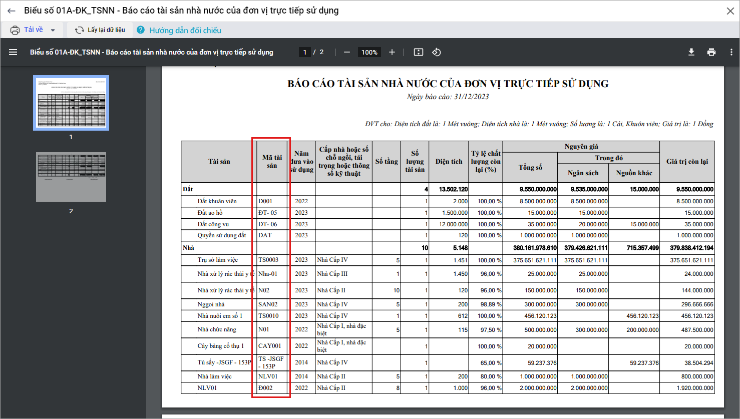 – Kể từ phiên bản R37: Khi anh/chị lập báo cáo chi tiết tài sản, có thông tin mã tài sản để dễ dàng đối chiếu giữa các báo cáo với nhau từ đó nhanh chóng tìm ra tài sản bị sai lệch.