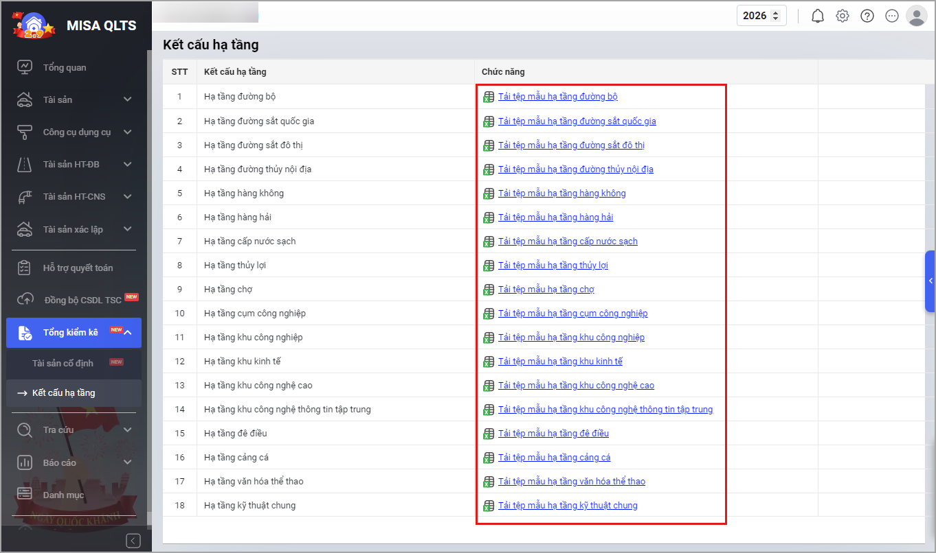 Tại menu Tổng kiểm kê\Kết cấu hạ tầng: Chỉnh sửa file xuất khẩu của 18 loại tài sản KCHT theo đúng Công văn 8131/BTC-QLCS của Bộ Tài chính