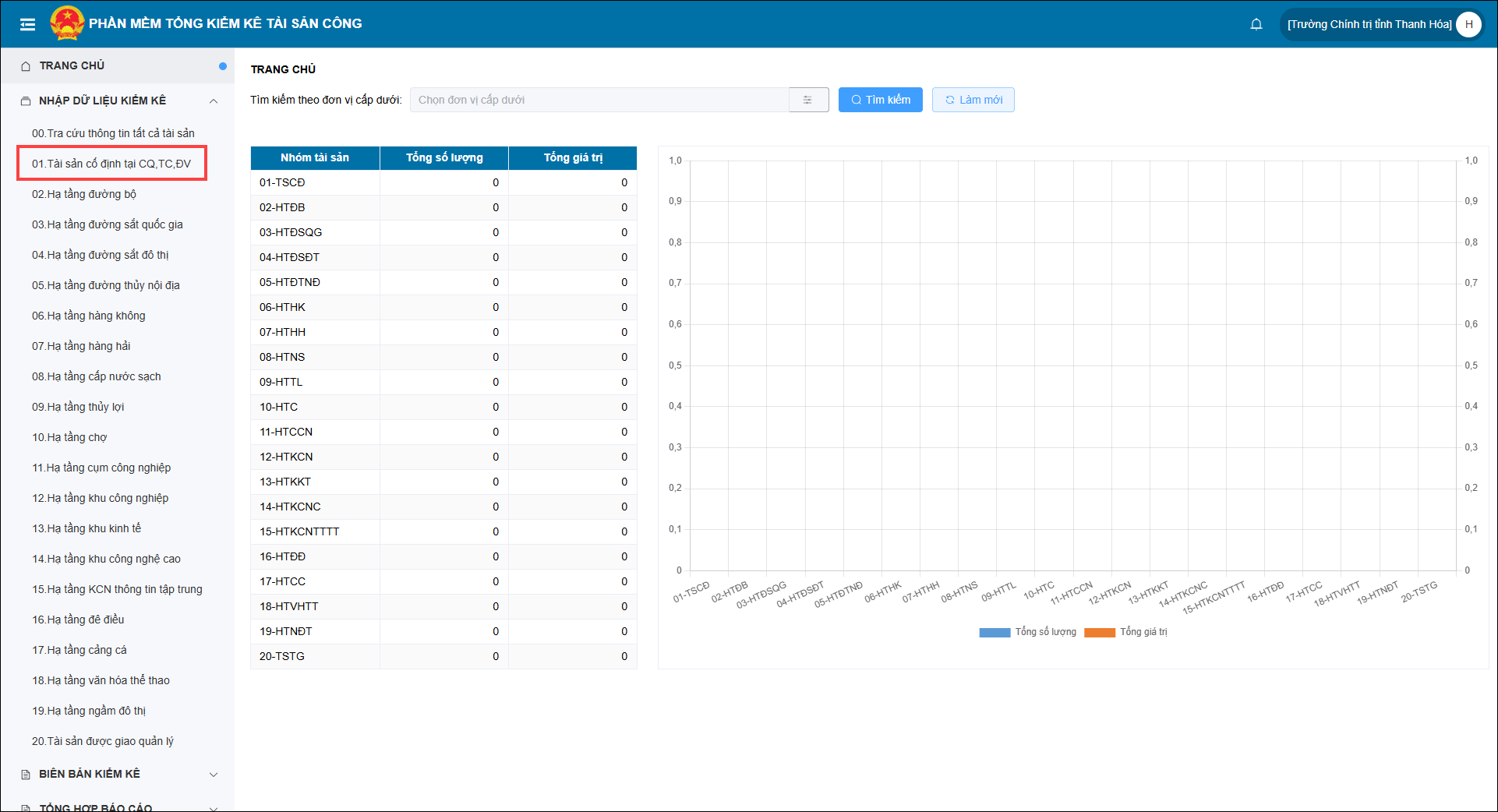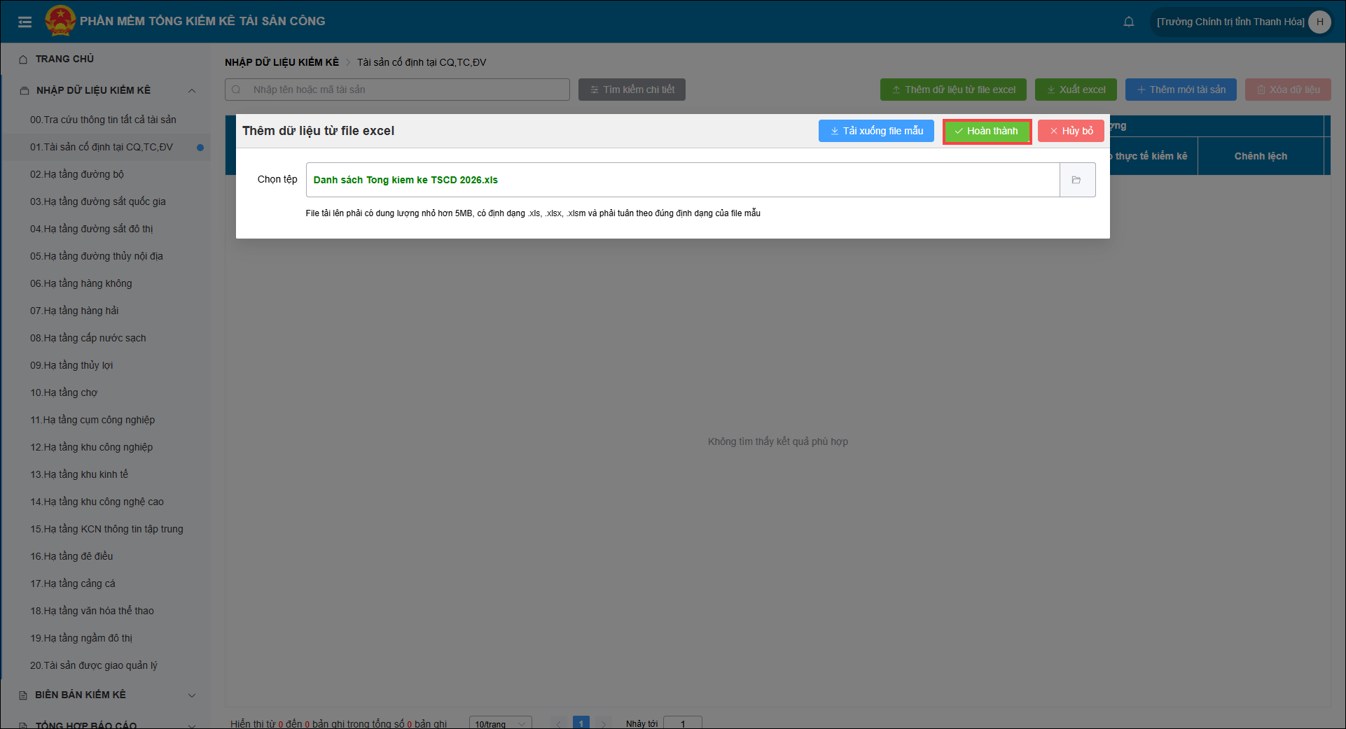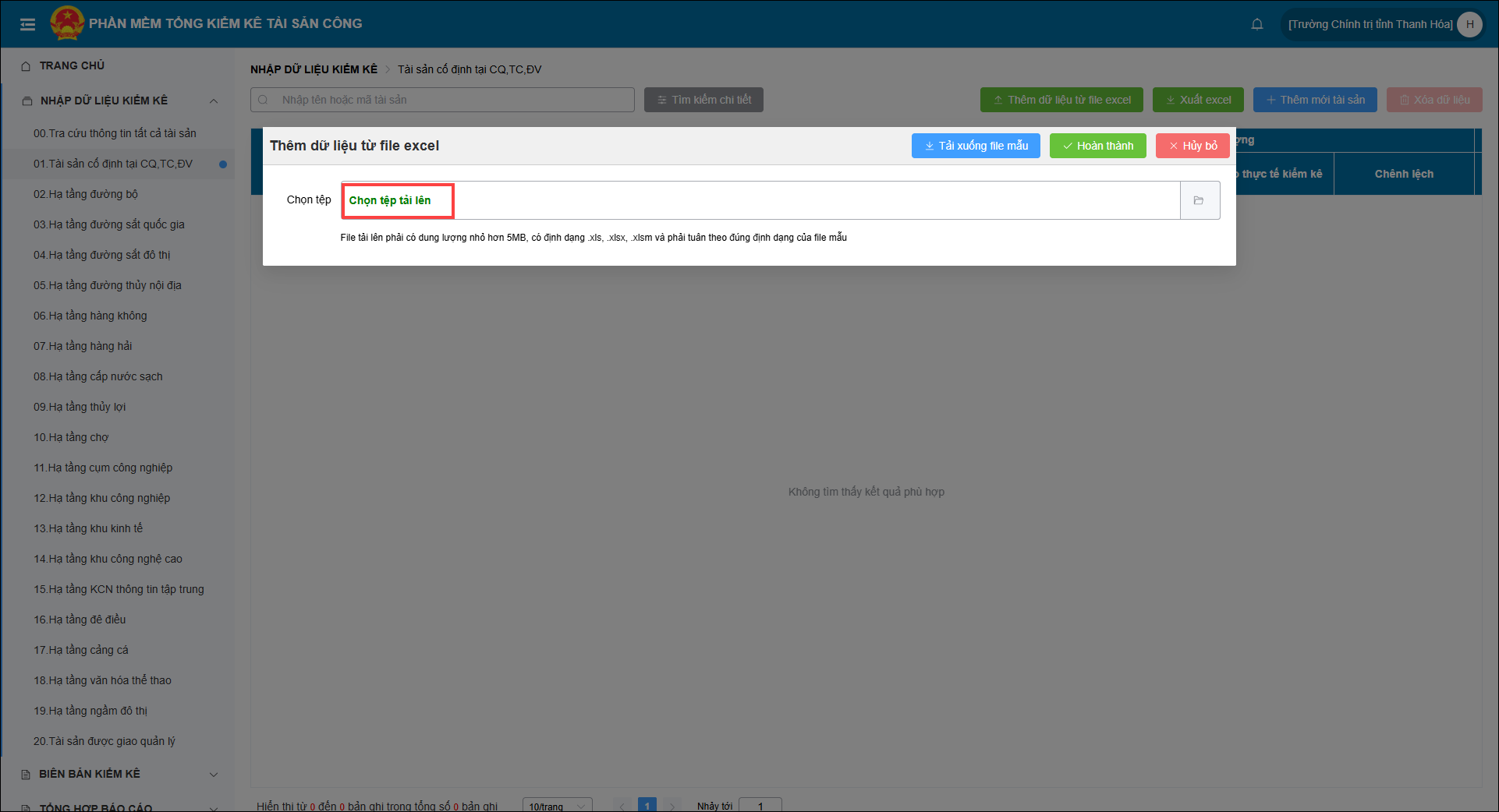 - Tại mục Nhập khẩu dữ liệu kiểm kê lựa chọn 1 trong các hạng mục như: Tài sản cố định; Hạ tầng đê điều; Hạ tầng chợ..v..v..