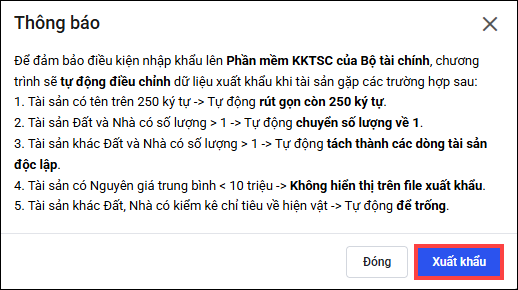 - Chương trình sẽ tự động điều chỉnh dữ liệu xuất khẩu để đảm bảo điều kiện nhập khẩu lên phần mềm KKTSC của bộ Tài chính. Anh/chị nhấn Xuất khẩu