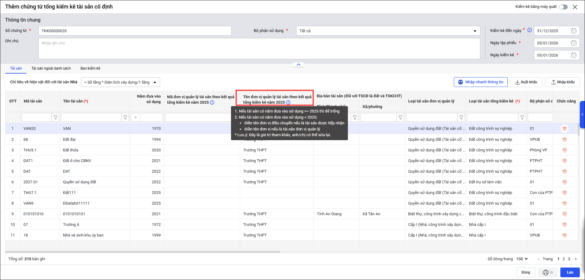 2. Phần mềm bổ sung cột Tài sản đơn vị quản lý giúp cán bộ QLTS biết được tài sản được sáp nhập từ đơn vị nào.