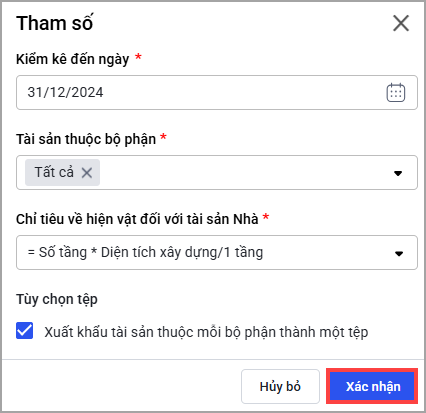 – Vào phần Tổng kiểm kê/Tài sản cố định/Quy trình. Nhấn chọn Xuất khẩu danh sách tài sản